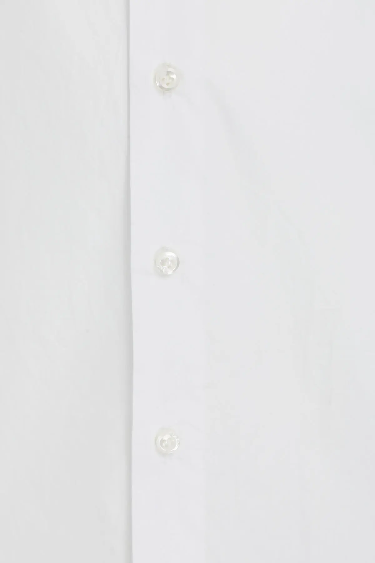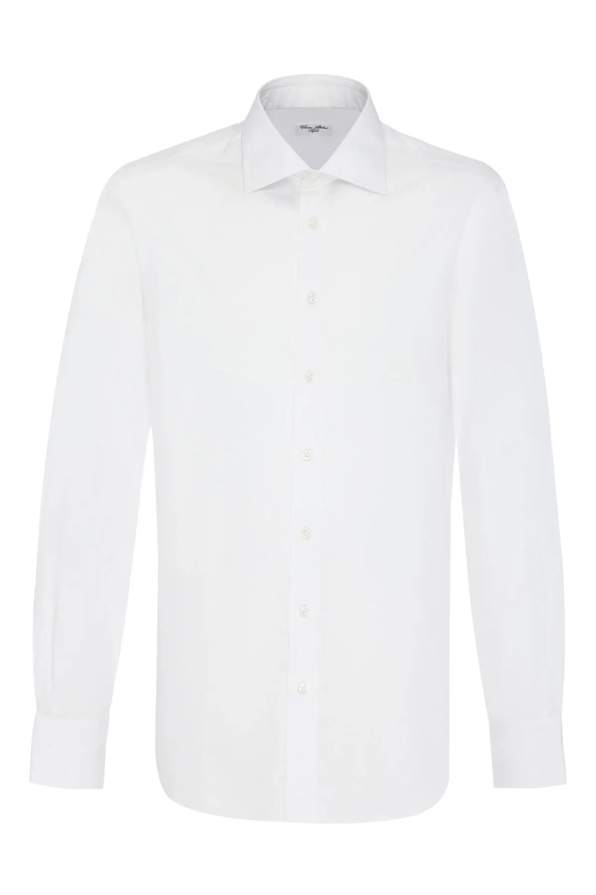 Классическая рубашка прямого кроя с длинными рукавами выполнена из гладкого хлопка белого цвета. Модель с отложным воротником и застежкой на пуговицы легко вписывается как в деловой, так и в торжественный образ. Нейтральный оттенок позволяет сочетать ее с любыми костюмами и аксессуарами.