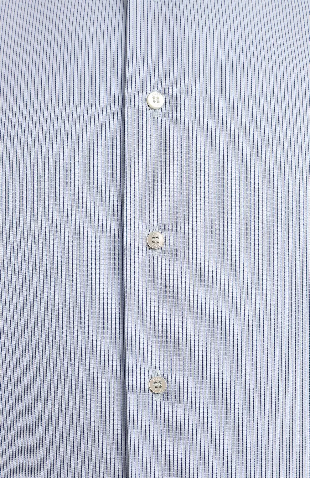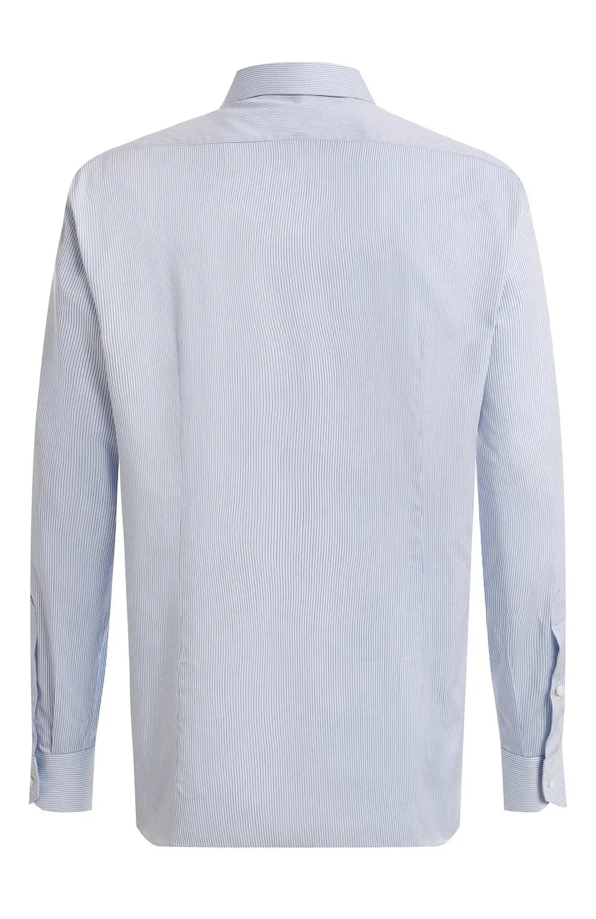 Хлопковая рубашка Zilli в тонкую голубую полоску. Модель классического кроя выполнена из мягкого итальянского хлопка, который отличается легкостью и воздухопроницаемостью. Воротник на стойке и перламутровые пуговицы придают изделию изысканность. Универсальный вариант для делового гардероба и утонченных повседневных образов.