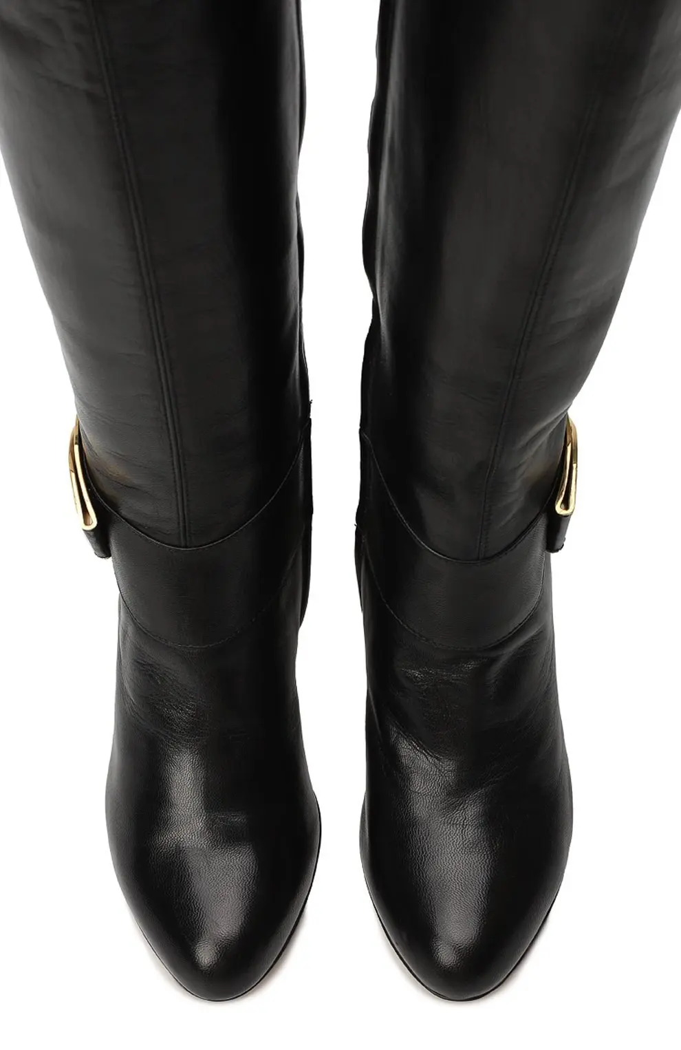 Сапоги Gancini Salvatore Ferragamo из гладкой черной кожи. Элегантная модель с акцентной пряжкой в форме фирменного мотива Gancini в золотистом тоне. Умеренный каблук придаёт женственный силуэт и делает пару удобной для повседневного ношения.