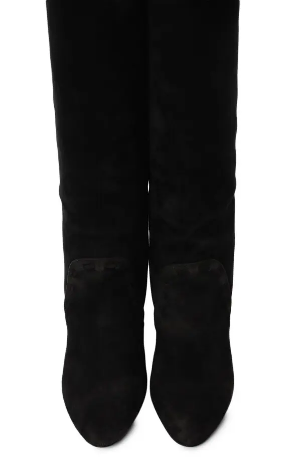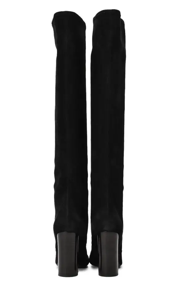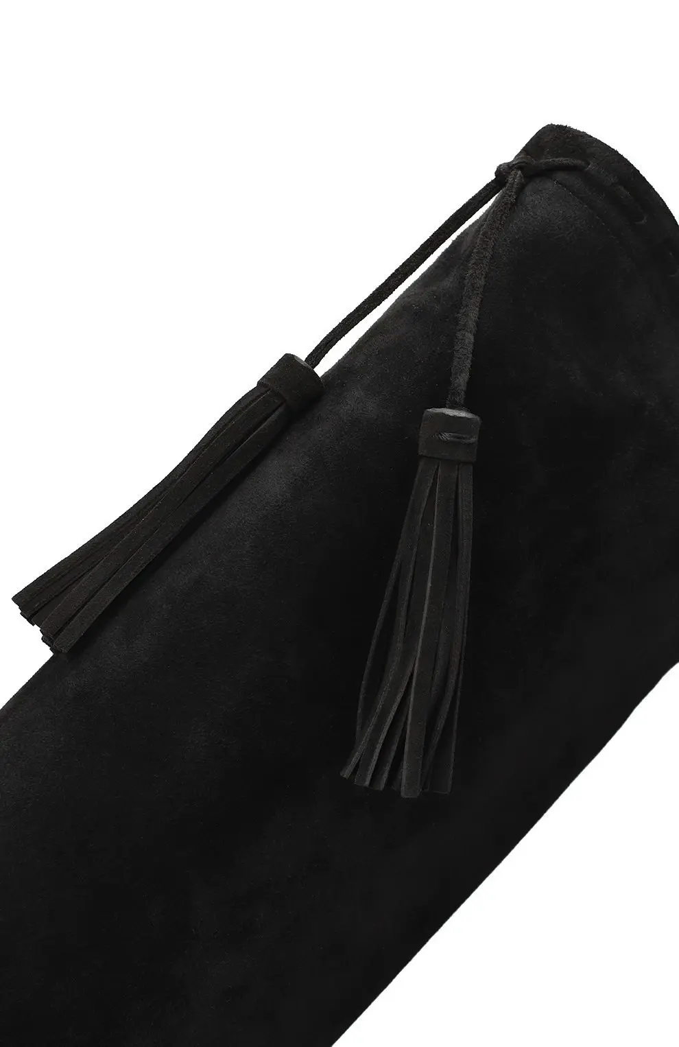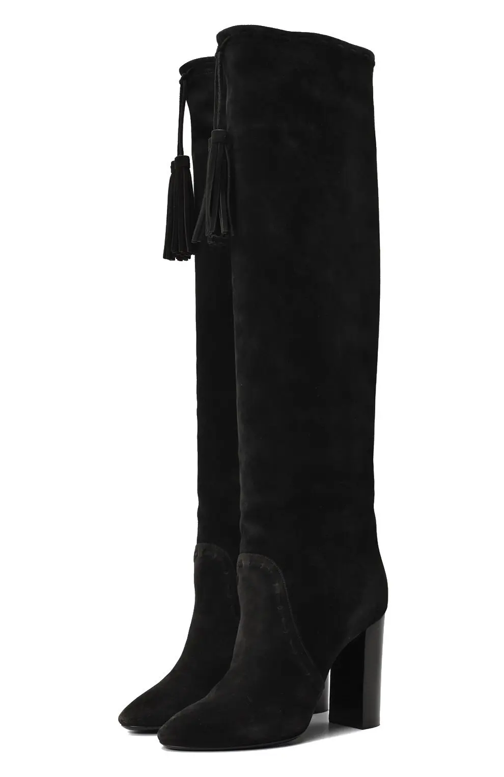 Ботфорты Meurice Saint Laurent выполнены из чёрной замши и выделяются изысканным минимализмом. Высокий голенище дополнено декоративными кисточками, придающими модели утончённый акцент. Устойчивый блочный каблук обеспечивает комфорт при носке, а элегантный силуэт подчёркивает женственность образа.