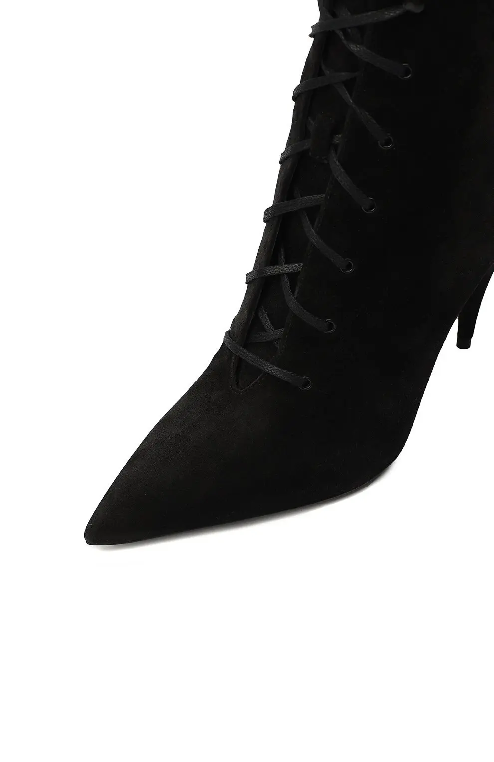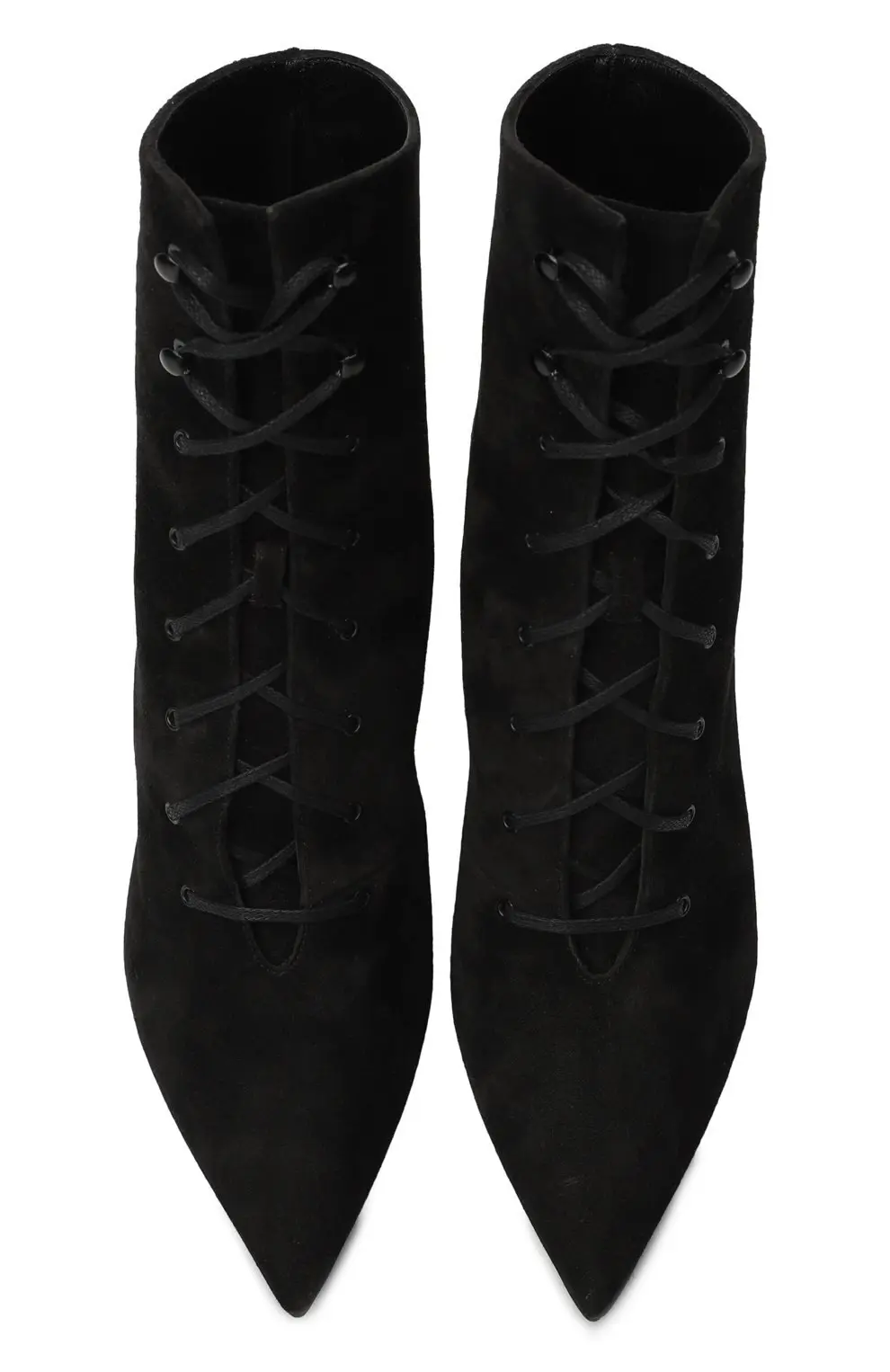 Ботильоны Kiki Saint Laurent выполнены из чёрной замши и отличаются изящным силуэтом с заострённым носком. Модель дополнена аккуратной шнуровкой, которая придаёт образу изысканную винтажную нотку. Узкий каблук-шпилька средней высоты подчеркивает женственность, сохраняя при этом удобство в движении. Эти ботильоны станут стильным акцентом в элегантных и вечерних комплектах.