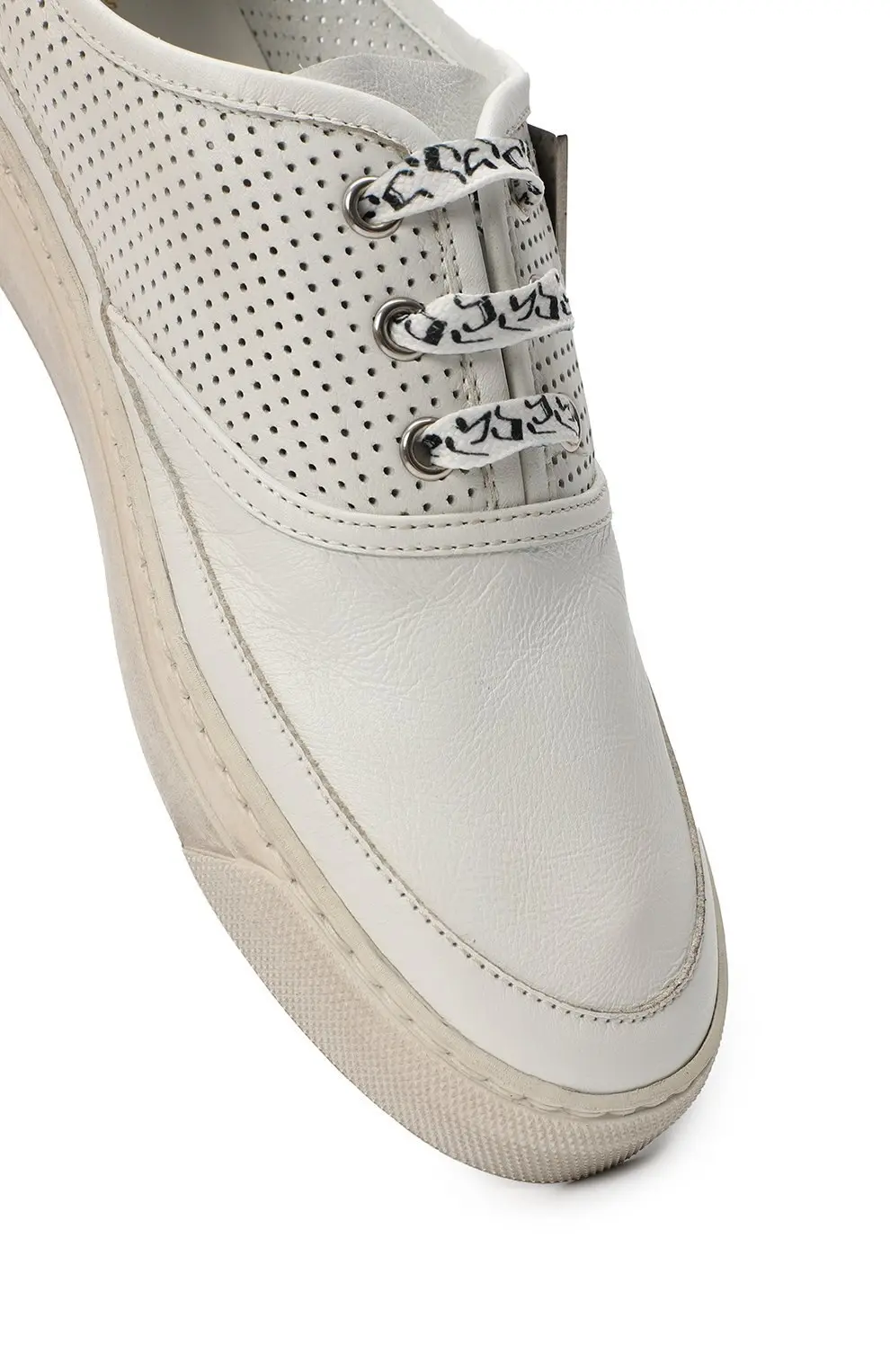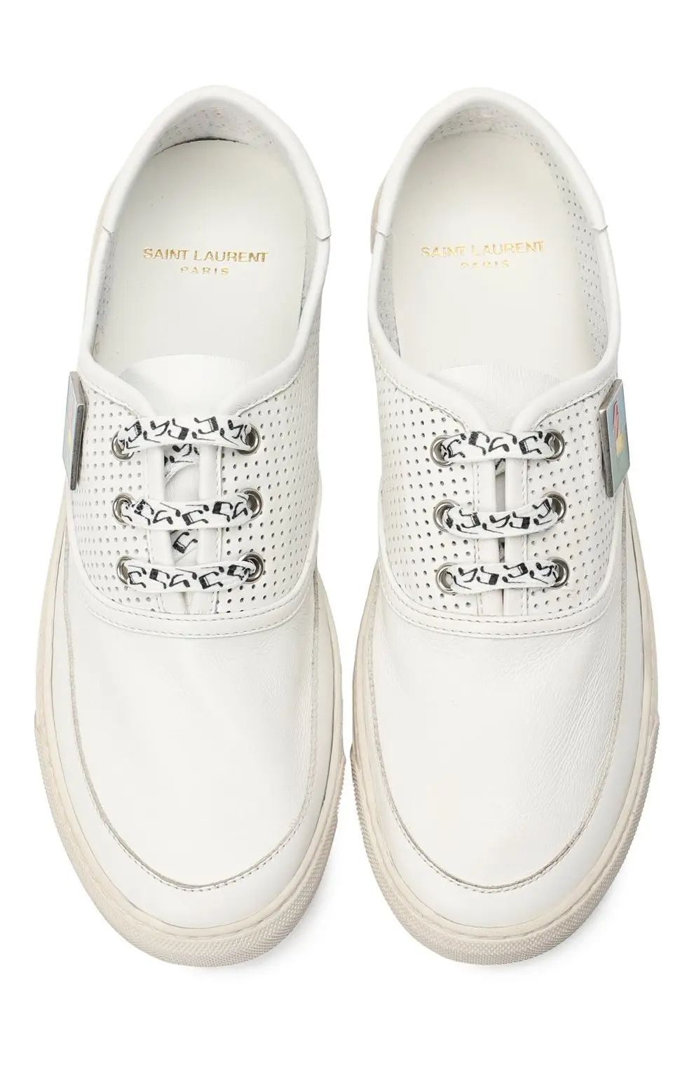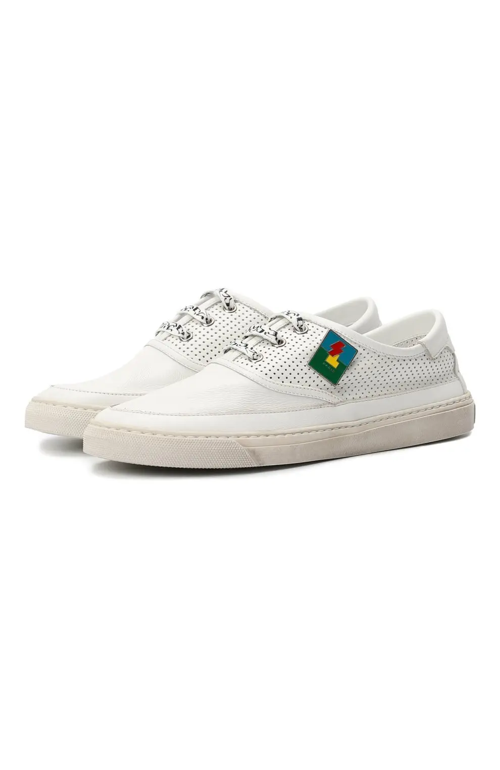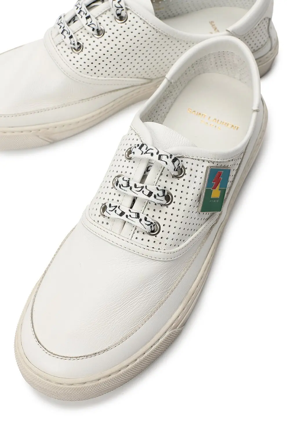Кеды Andy от Saint Laurent выполнены из белой гладкой кожи с перфорированными вставками, что придаёт модели современный и лёгкий характер. Лаконичный силуэт с низким берцем дополнен удобной шнуровкой и массивной подошвой, создающей баланс между классикой и спорт-шиком. Акцентом служит фирменный нашивной патч с контрастным рисунком в ретро-стиле, который добавляет динамики образу. Универсальные и стильные, эти кеды станут удачным завершением как повседневных, так и смарт-кэжуал ансамблей.