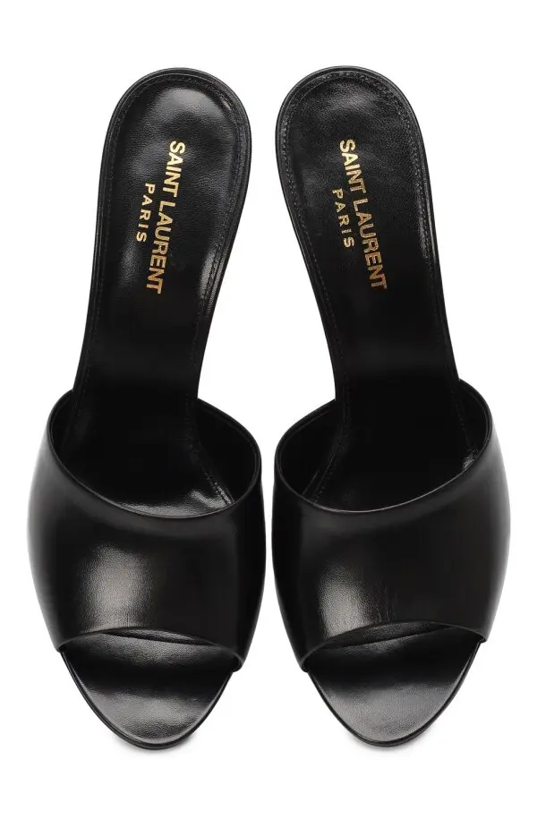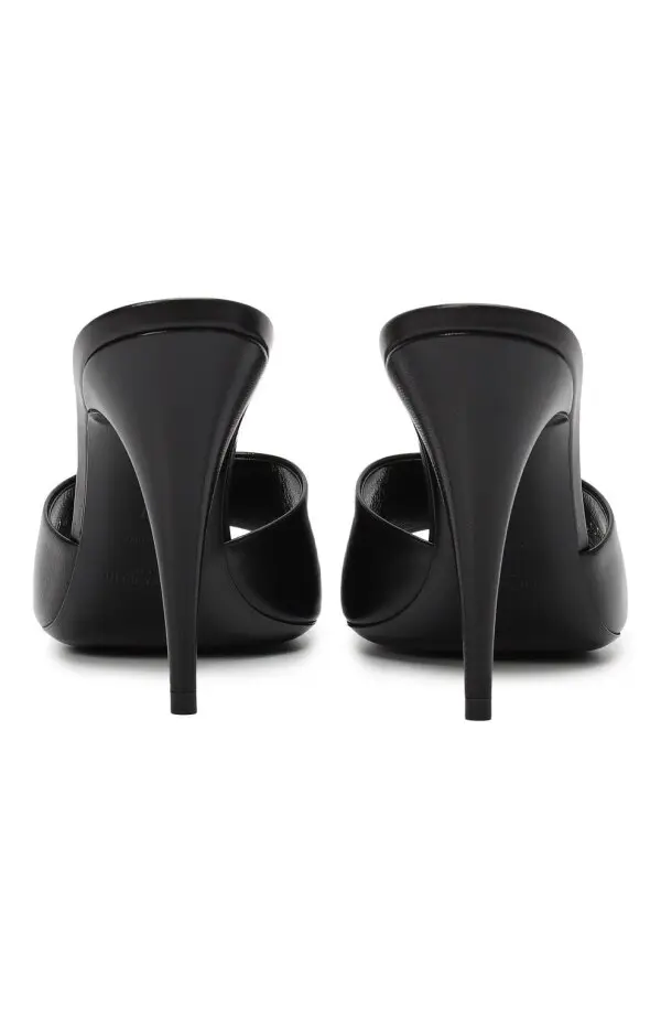 Мюли La 16 Saint Laurent выполнены из гладкой чёрной кожи в лаконичном минималистичном стиле. Открытый мыс и аккуратный силуэт подчёркивают элегантность модели, а высокий тонкий каблук-шпилька добавляет изысканности. Эти мюли станут универсальным элементом гардероба для деловых и вечерних образов.
