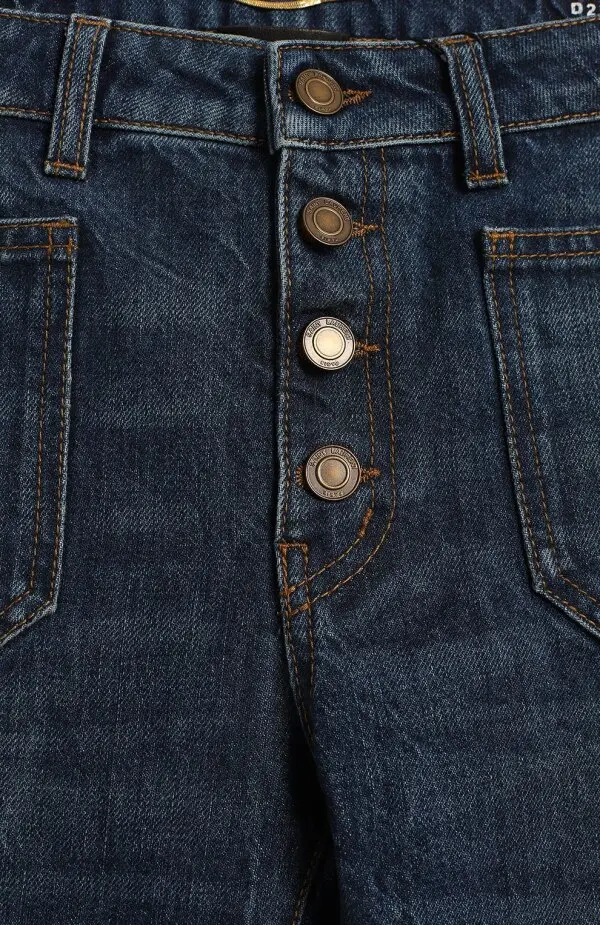 Джинсы Saint Laurent из плотного денима тёмно-синего оттенка. Модель с лёгким эффектом потертости и застёжкой на пуговицы — современная интерпретация классического винтажного стиля.