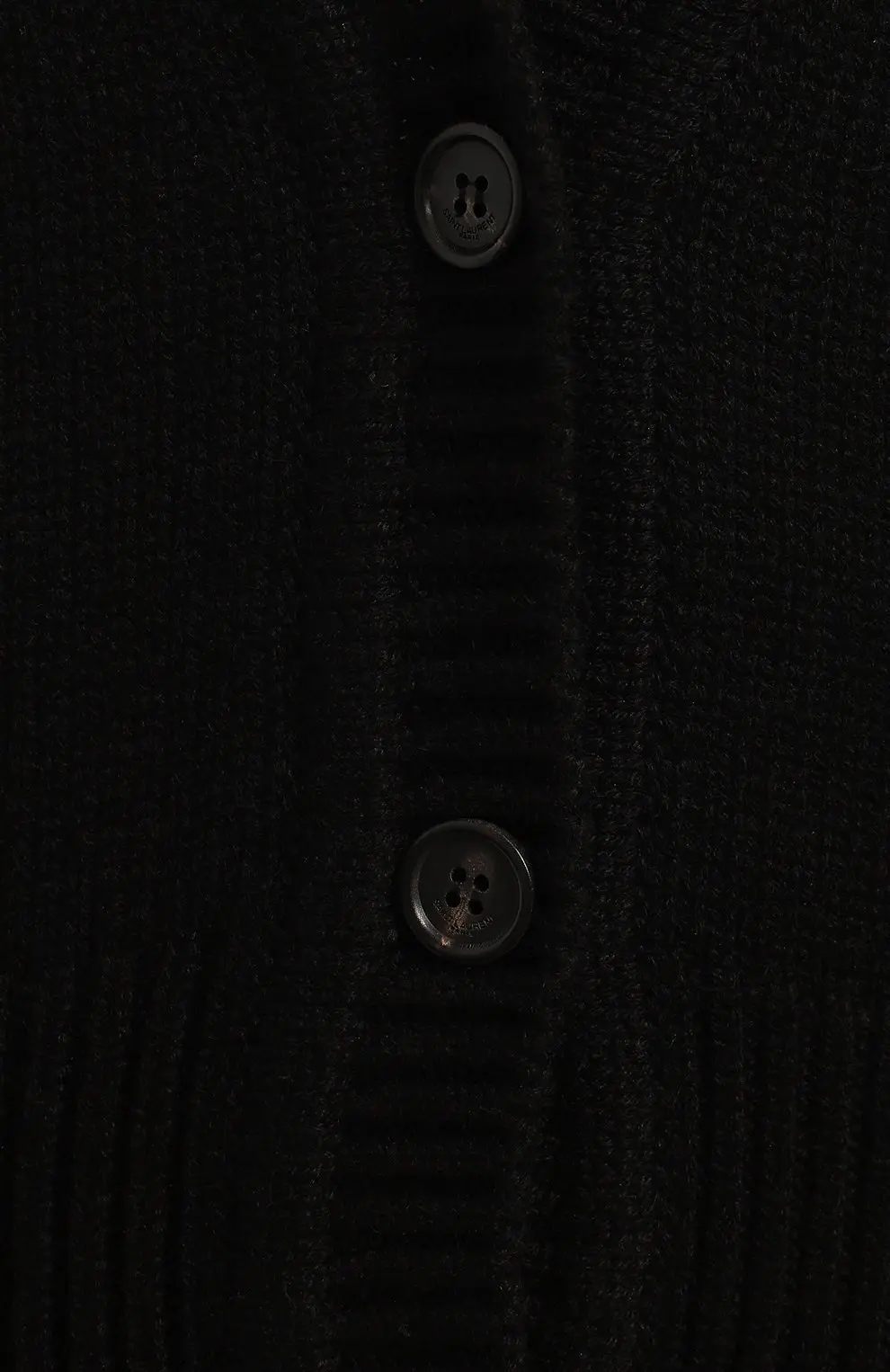 Кашемировый кардиган Saint Laurent черного цвета. Модель с глубоким V-образным вырезом и застежкой на пуговицы оформлена лаконичным логотипом бренда, вышитым тон в тон. Мягкий кашемир придает изделию комфорт и элегантность.