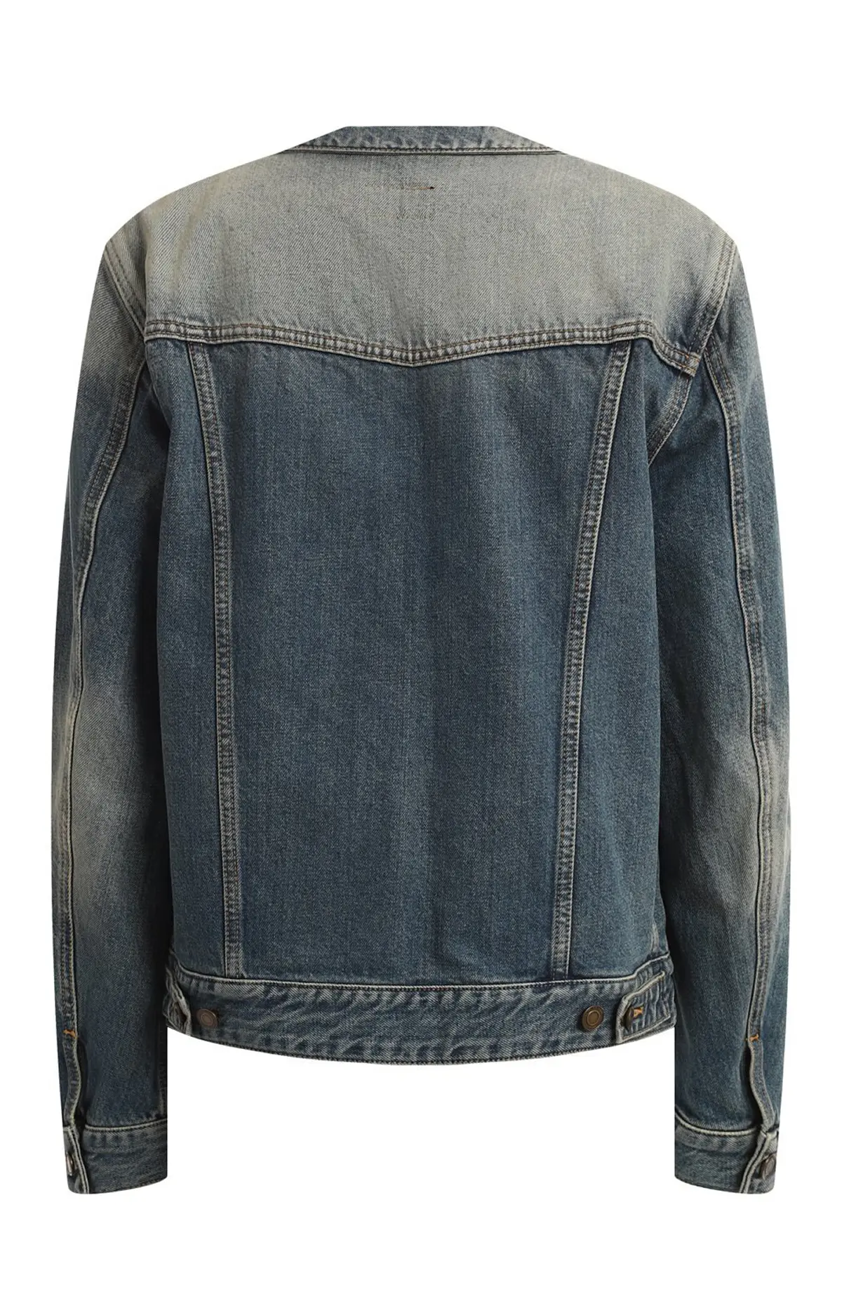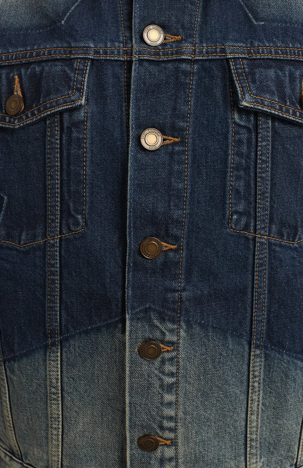 Джинсовая куртка из плотного хлопка выполнена в технике контрастного стон-вайша с эффектом геометрического колор-блокинга. Прямой укороченный силуэт с классическими накладными карманами и металлической фурнитурой подчеркивает фирменную рок-эстетику бренда.