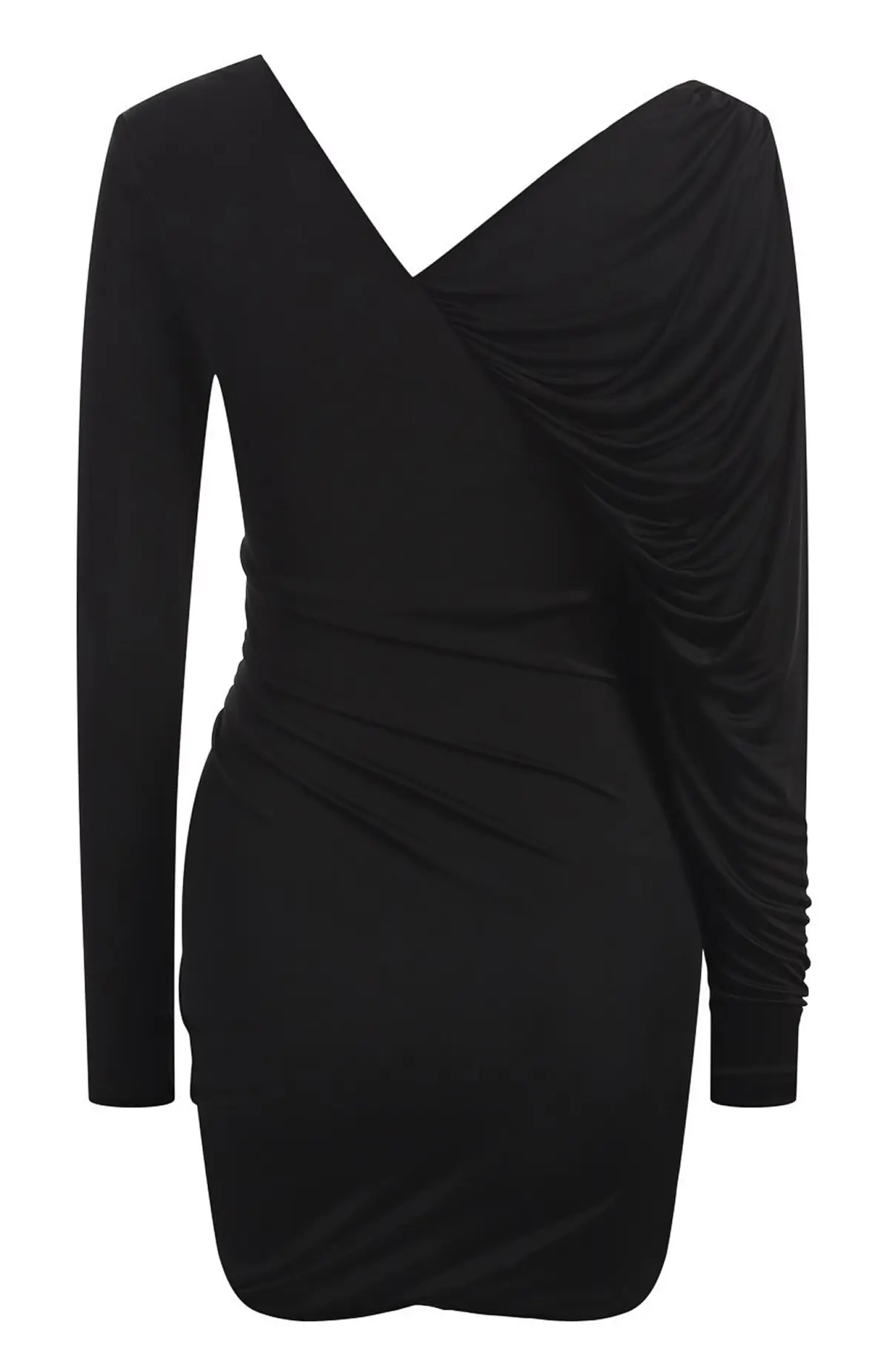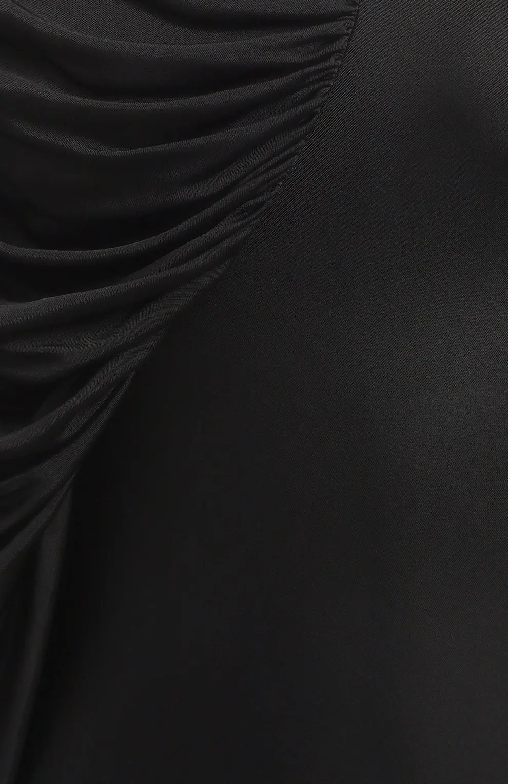 Платье из вискозы Saint Laurent черного цвета. Асимметричный крой и драпировка подчеркивают силуэт, создавая эффект скульптурности. Элегантная модель сочетает минимализм и драматичность, типичные для эстетики бренда.