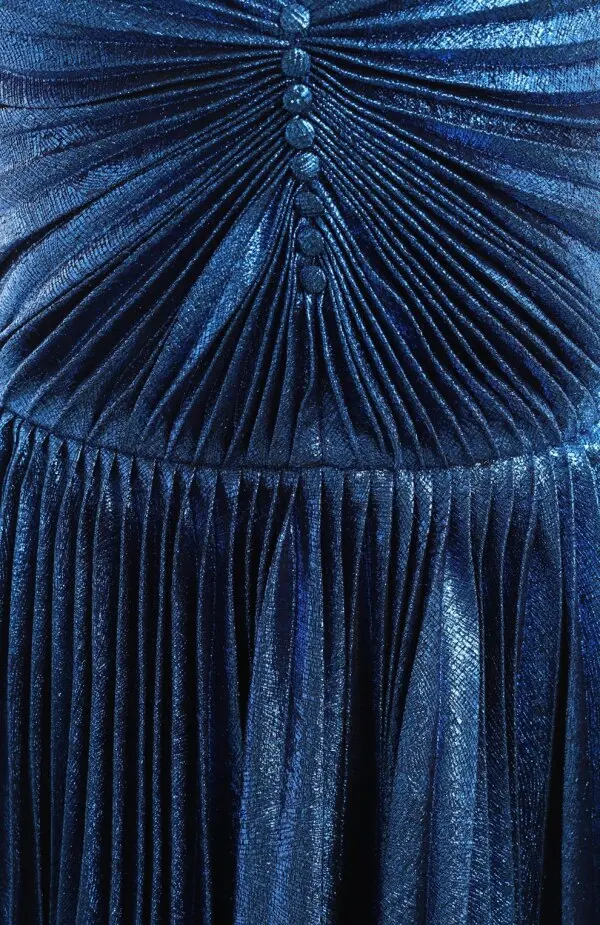 Шелковое платье Saint Laurent насыщенного синего оттенка. Модель с тонкими бретелями и драпировкой по лифу выполнена из струящегося шелка с деликатным блеском, создавая утончённый вечерний образ.