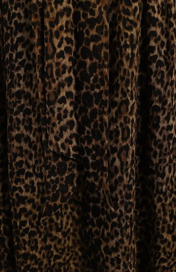 Мини-платье из тонкой шерсти оформлено фирменным леопардовым принтом, создающим выразительный акцент в образе. Свободный силуэт с легкими складками и полупрозрачными рукавами дополняет воротник с длинными завязками, которые можно носить бантом или оставлять распущенными. Модель подойдет как для вечерних выходов, так и для смелых повседневных комбинаций с высокими сапогами или ботильонами.