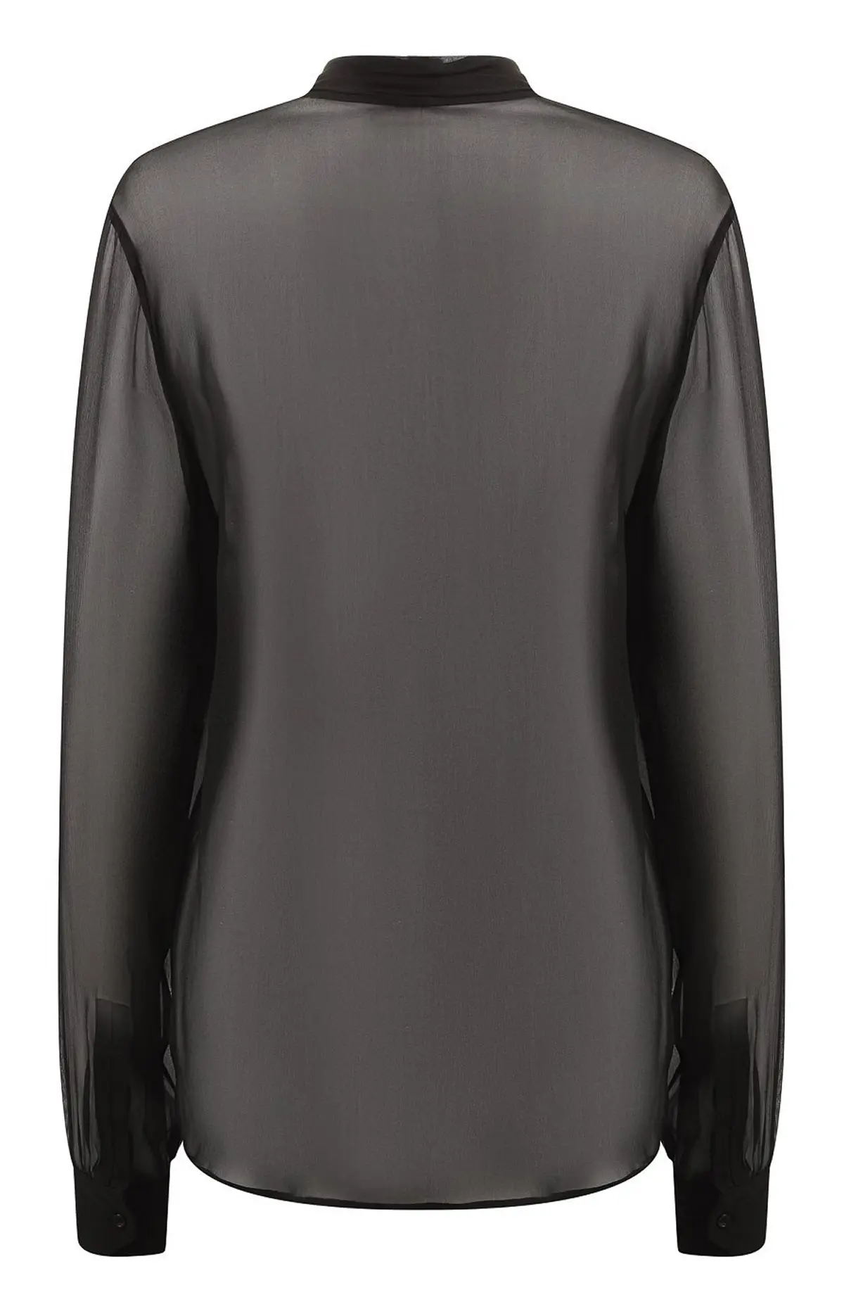Шелковая блузка Saint Laurent черного цвета. Полупрозрачная ткань придает образу чувственность, а крупный бант на воротнике добавляет элегантности в духе классического парижского стиля.