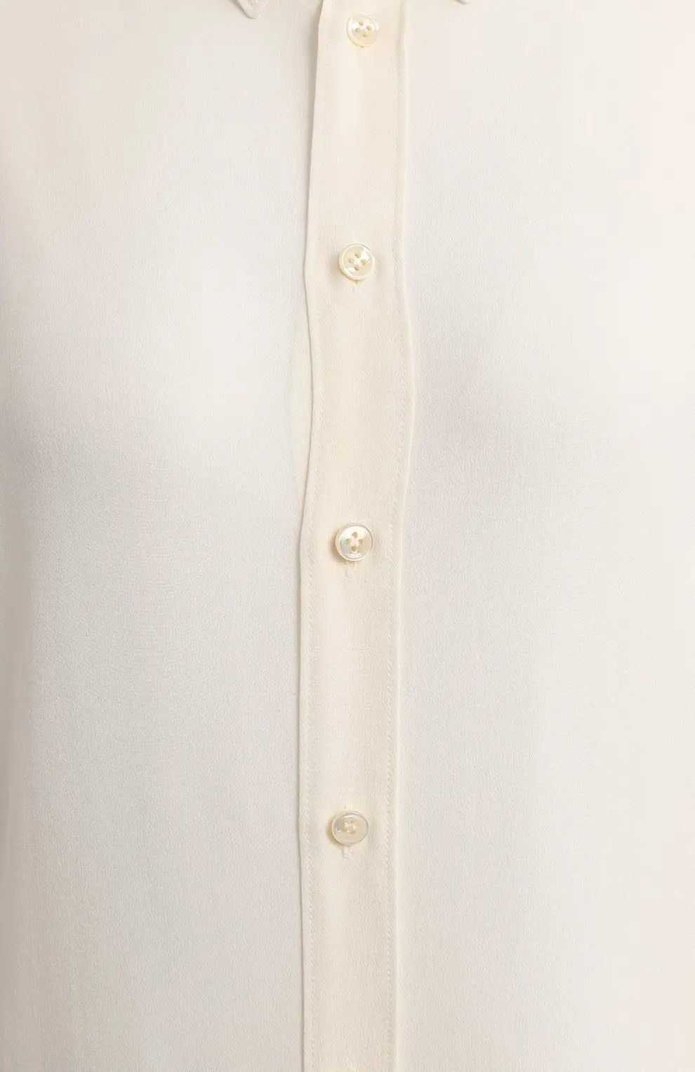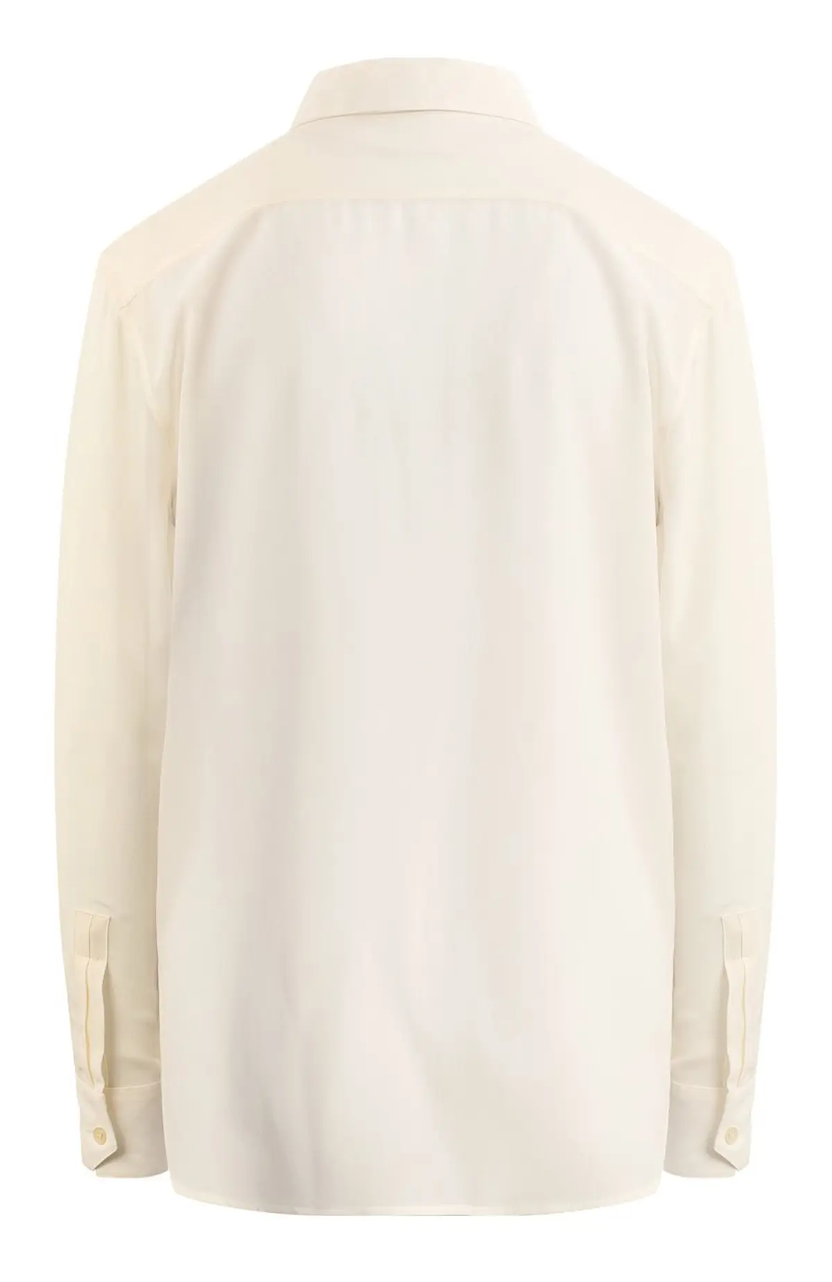 Шелковая блузка Saint Laurent кремового оттенка. Лаконичный крой с классическим воротником и застежкой на пуговицы подчеркивает утонченную элегантность бренда.