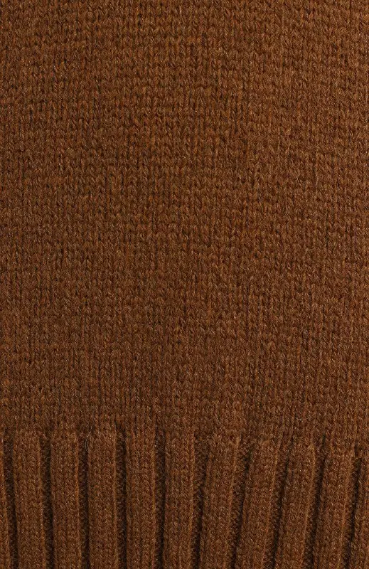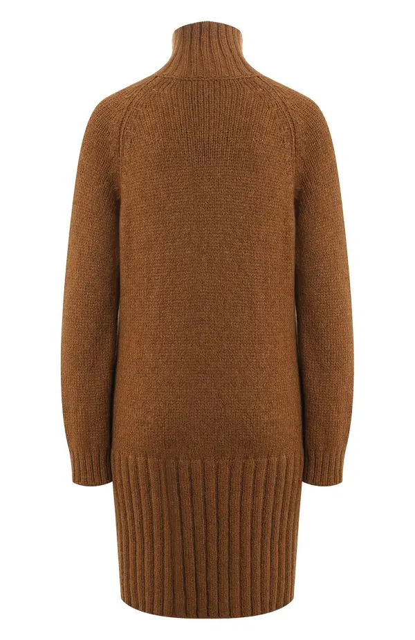 Платье Saint Laurent из мягкой шерсти насыщенного коричневого оттенка. Модель с высоким воротником и широкими резинками по краю придаёт уютный, лаконичный силуэт и идеально подходит для холодного сезона.