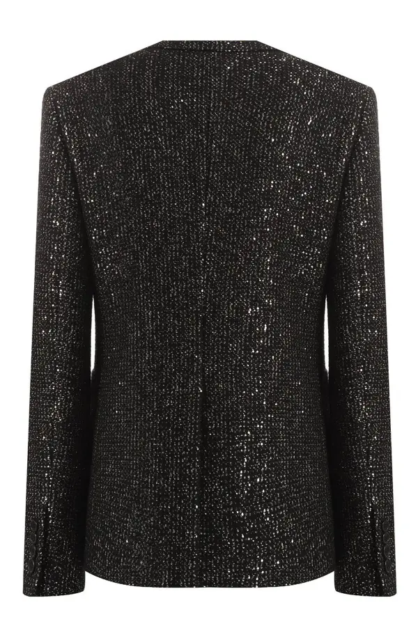 Жакет от Saint Laurent выполнен из чёрной шерстяной ткани с изысканным блестящим эффектом, создающим элегантное сияние. Двубортный фасон с акцентированными плечами и глубоким V-образным вырезом подчёркивает фирменный стиль Дома, соединяющий строгость и вечернюю роскошь. Модель дополнена шестью пуговицами и прямым кроем, что делает её идеальным выбором как для официальных выходов, так и для эффектных вечерних образов.