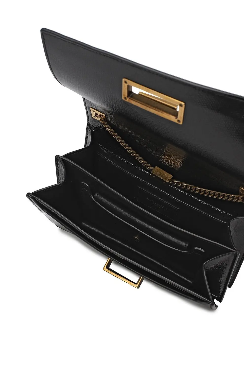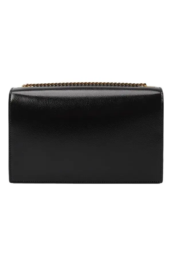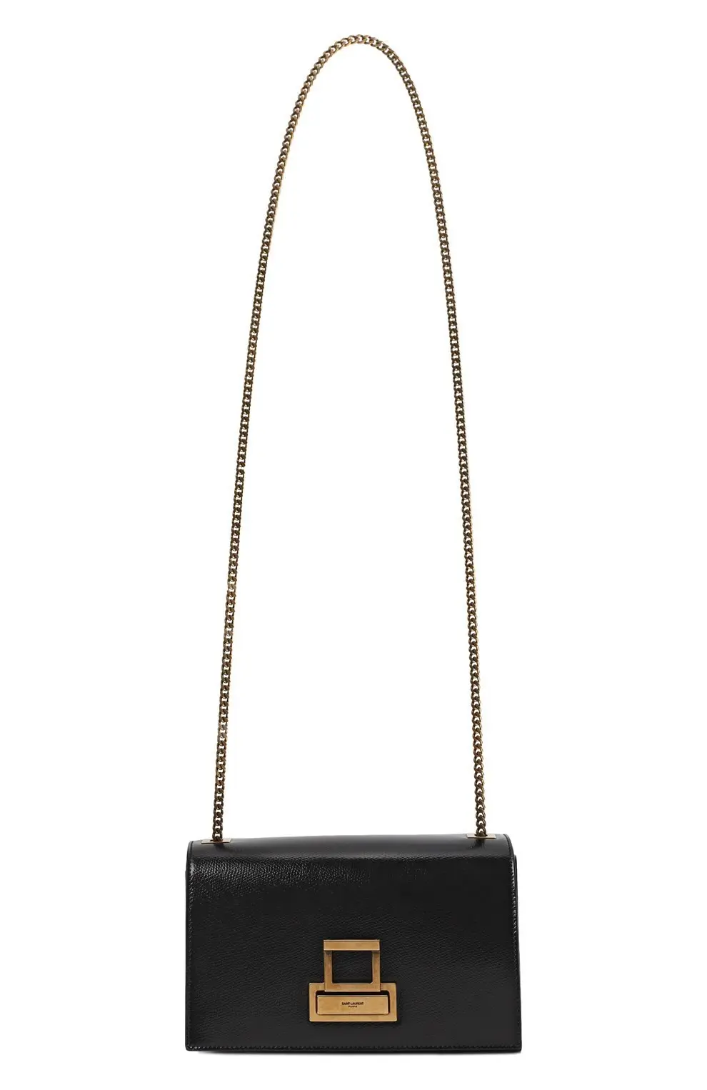 Классическая сумка Metropolis от Saint Laurent выполнена из чёрной кожи с лёгкой фактурой и украшена винтажной пряжкой из металла с золотистым покрытием. Строгий прямоугольный силуэт и цепочный ремень делают её универсальной — для повседневных и вечерних образов.
