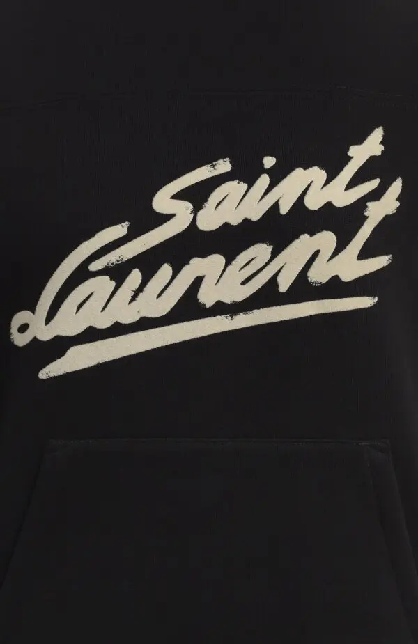 Худи из мягкого хлопкового футера с лаконичным силуэтом и регулируемым капюшоном. Контрастный логотип Saint Laurent на груди придаёт модели выразительный акцент. Кенгуру-карман и эластичные трикотажные края обеспечивают комфорт в повседневных образах.