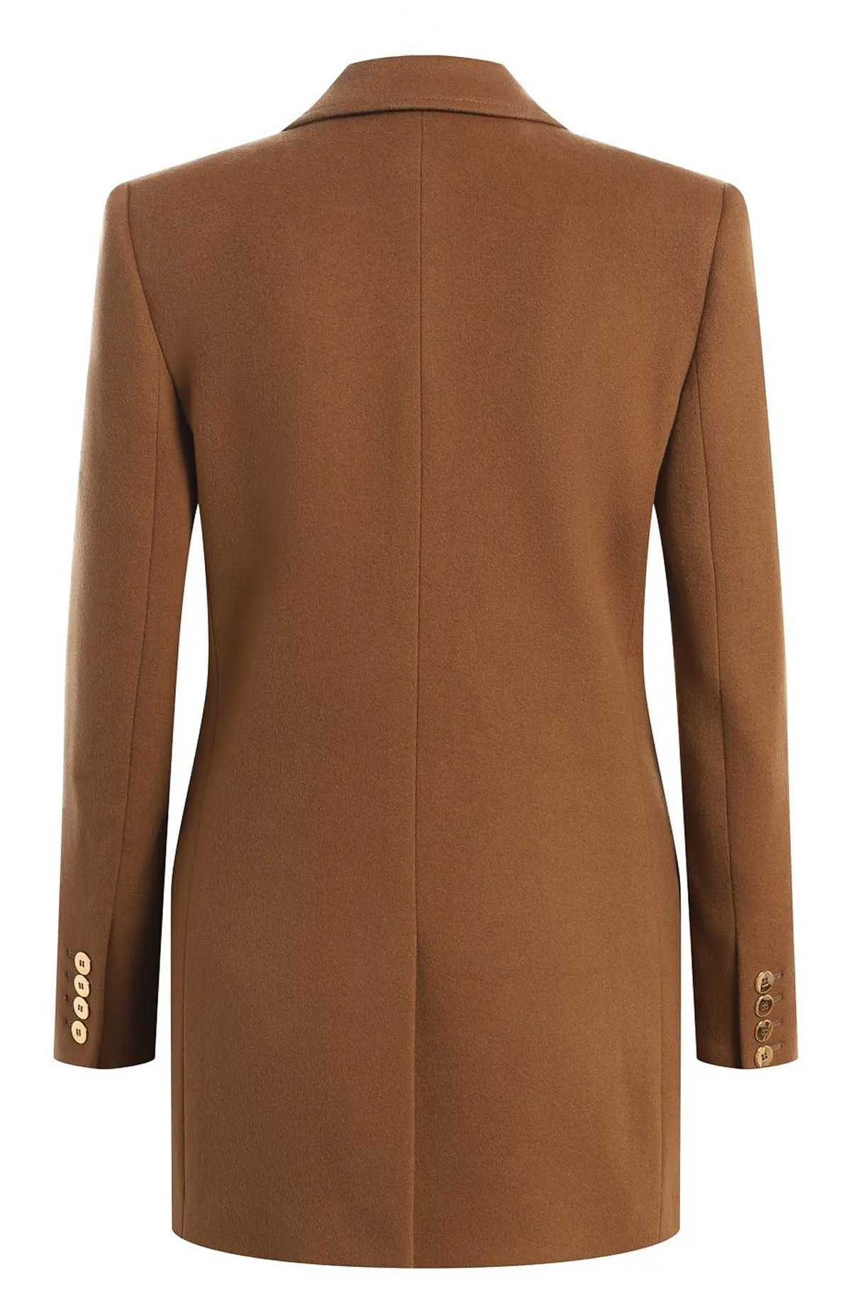 Жакет от Saint Laurent выполнен из смеси шерсти и кашемира в насыщенном карамельно-коричневом оттенке. Двубортный фасон с широкими лацканами и золотистыми пуговицами придаёт образу выразительность и элегантность. Прямой крой с акцентом на плечи подчёркивает силуэт, а классические карманы с клапанами добавляют функциональности. Идеальный вариант для стильных повседневных и вечерних ансамблей.