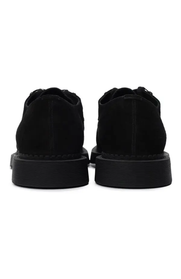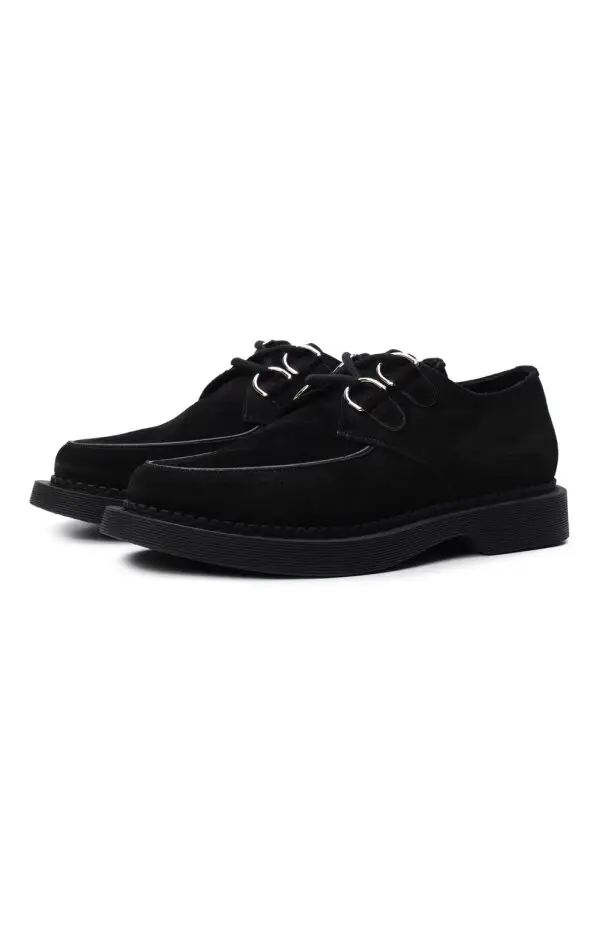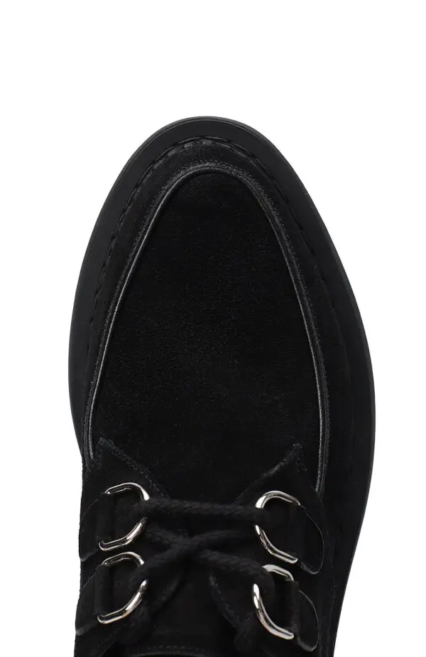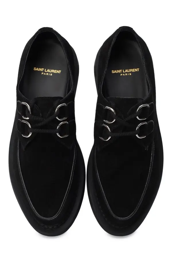 Ботинки Teddy Saint Laurent выполнены из мягкой чёрной замши и отличаются лаконичным силуэтом с утолщённой рифлёной подошвой. Металлические люверсы и двойная шнуровка добавляют модели дерзости и современного характера. Универсальный дизайн позволяет сочетать их как с повседневными, так и с более смелыми образами.