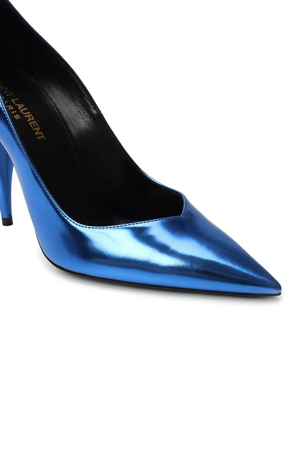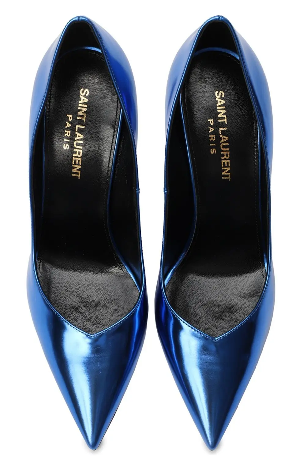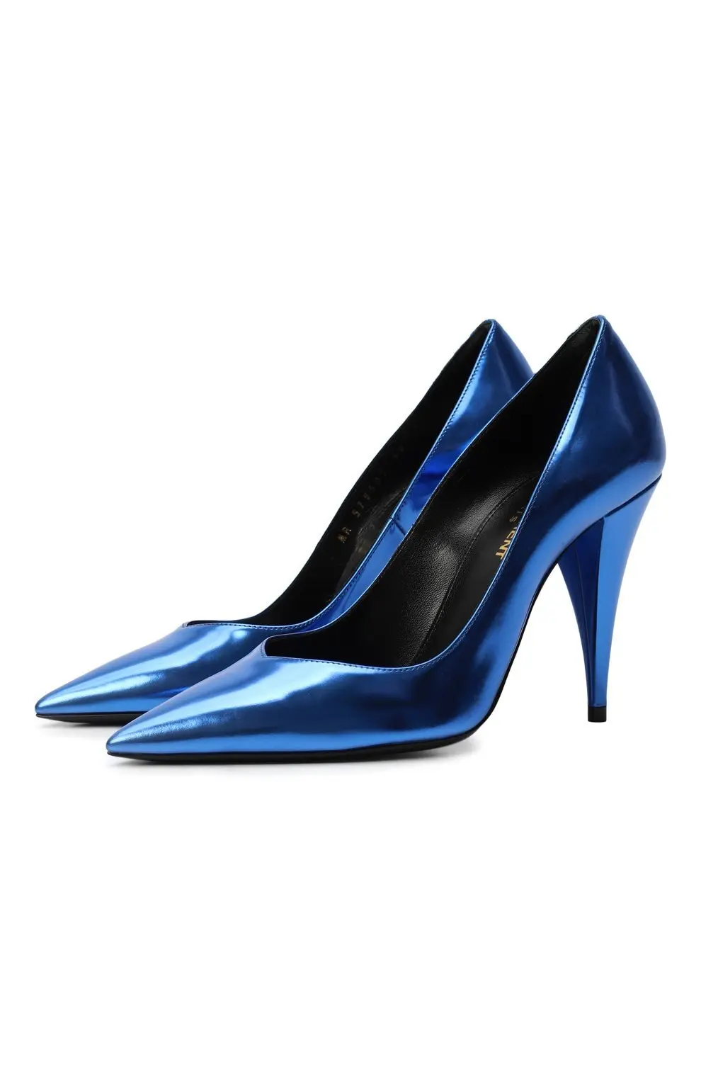 Туфли Kiki 100 от Saint Laurent в эффектном металлическом синем оттенке станут ярким акцентом любого наряда. Лаконичный силуэт с острым мысом, шпилькой высотой 100 мм и глянцевым финишем отражает смелый и гламурный стиль Дома.