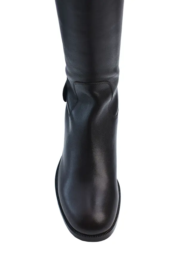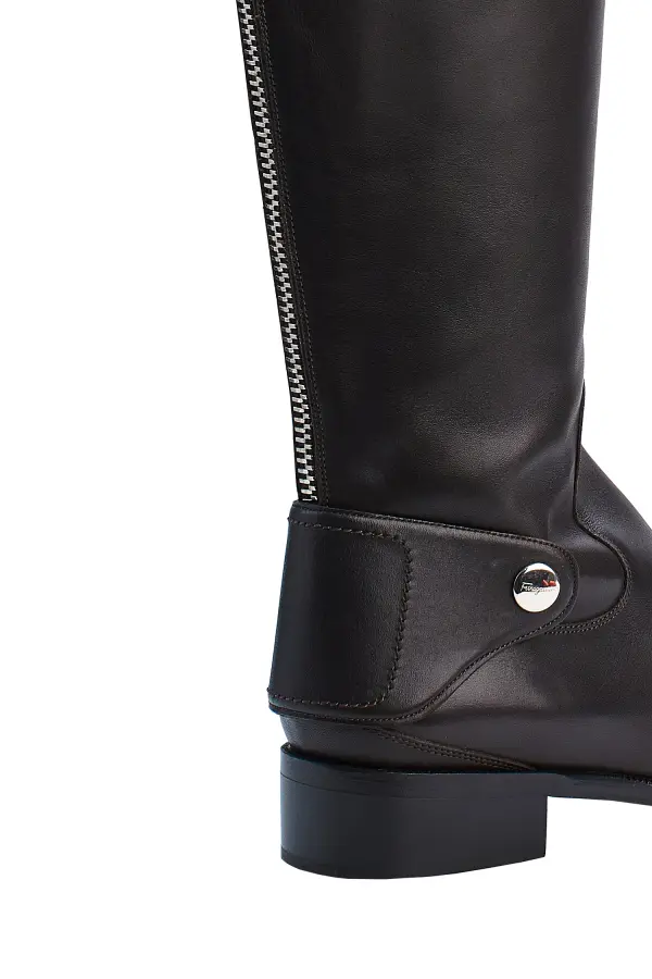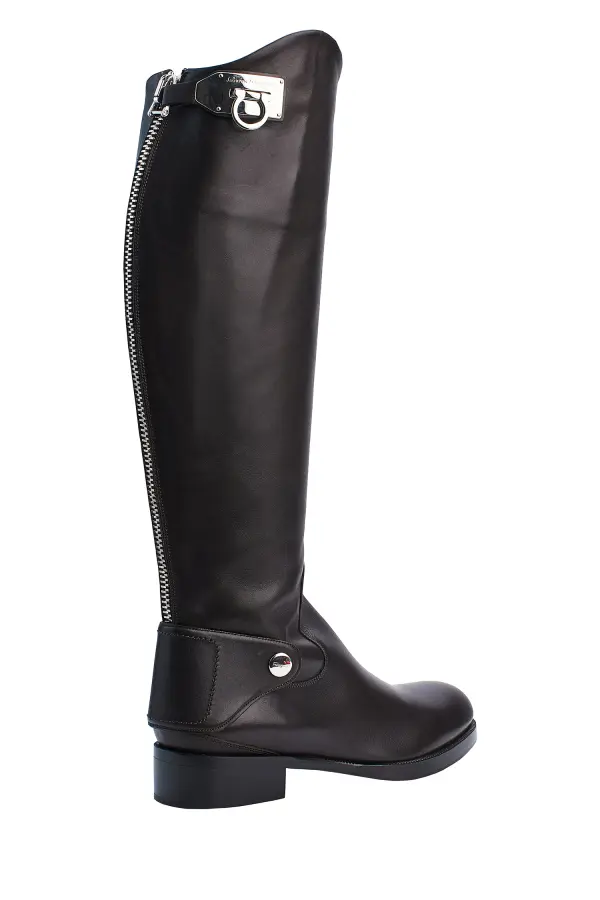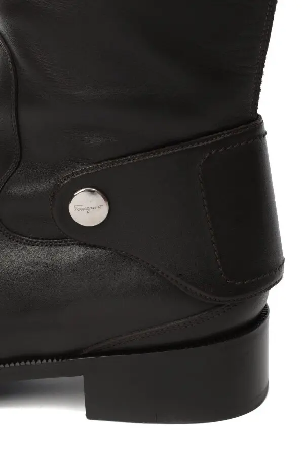 Сапоги Salvatore Ferragamo из гладкой чёрной кожи. Элегантная модель в стиле жокейских ботфортов с декоративной металлической пряжкой Gancini и низким устойчивым каблуком.