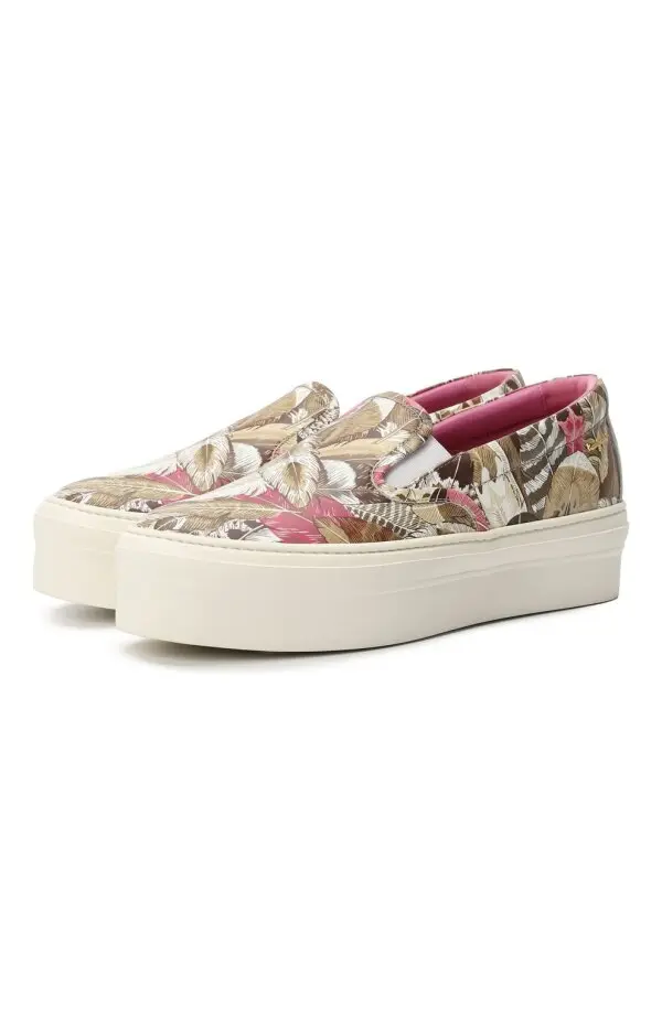 Слипоны Salvatore Ferragamo выполнены из мягкой кожи с ярким принтом в виде тропических листьев и перьев. Контрастная внутренняя отделка и массивная белая подошва придают модели современный и динамичный вид. Эластичные вставки по бокам обеспечивают удобство при надевании и комфорт при носке. Элегантное сочетание дизайна и итальянского качества делает пару стильным акцентом повседневного образа.