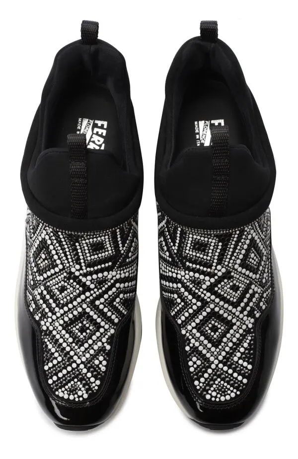 Эти кроссовки от Salvatore Ferragamo выделяются эффектным дизайном: верх украшен сверкающим орнаментом из страз, дополнен вставками из лаковой кожи и массивной контрастной подошвой. Они создают дерзкий и современный акцент, идеально подходящий для смелых и выразительных образов.
