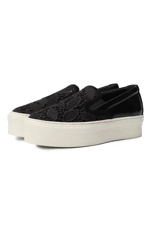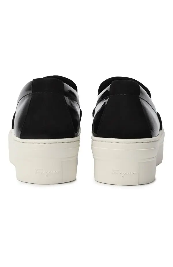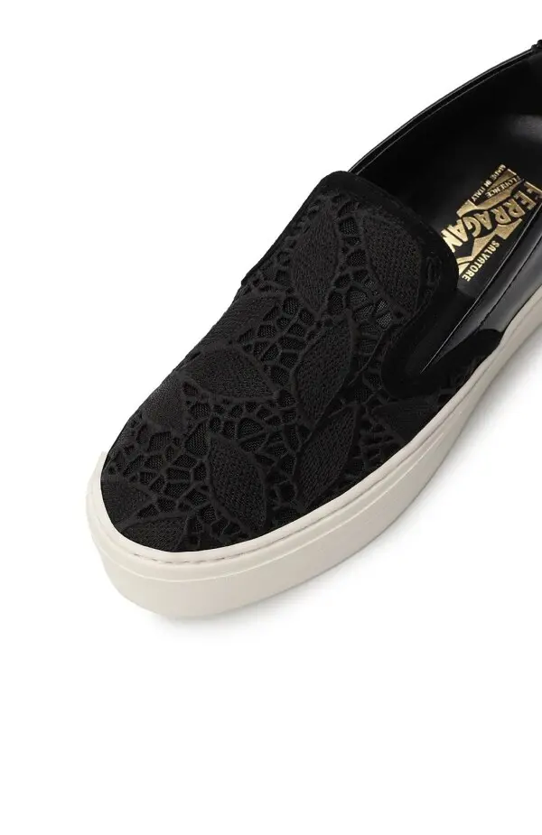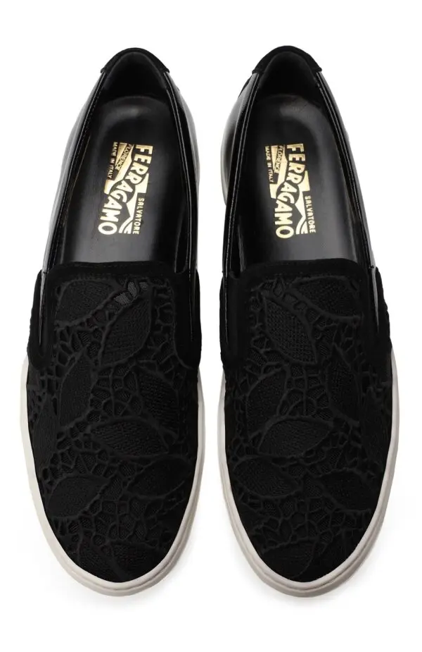 Женские слипоны Salvatore Ferragamo — стильная и практичная модель, сочетающая комфорт спортивной обуви с изысканными деталями итальянского дизайна. Верх выполнен из черного кружева с объемным флористическим узором, дополненным гладкими вставками из лакированной кожи, что придает образу современную женственность. Контрастная белая платформа подчеркивает актуальность силуэта и обеспечивает удобство при носке. Эти слипоны станут универсальным выбором для городских образов, добавляя элегантности даже в повседневный стиль.