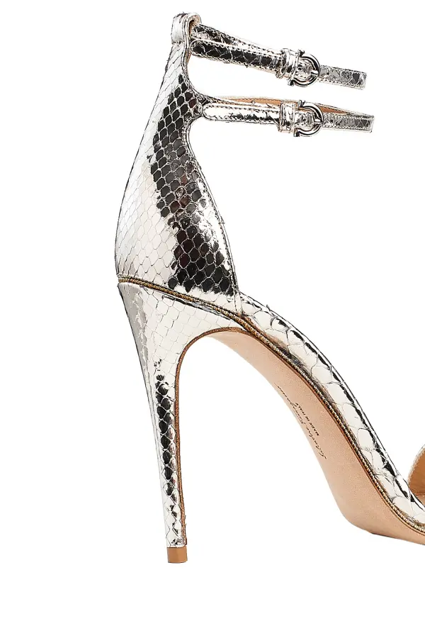 Босоножки Salvatore Ferragamo выполнены из натуральной кожи питона с металлическим блеском. Элегантная пара на высоком каблуке-шпильке дополнена двумя тонкими ремешками с застежками на щиколотке. Минималистичный дизайн подчеркивает изящество силуэта и добавляет образу вечерней утонченности.