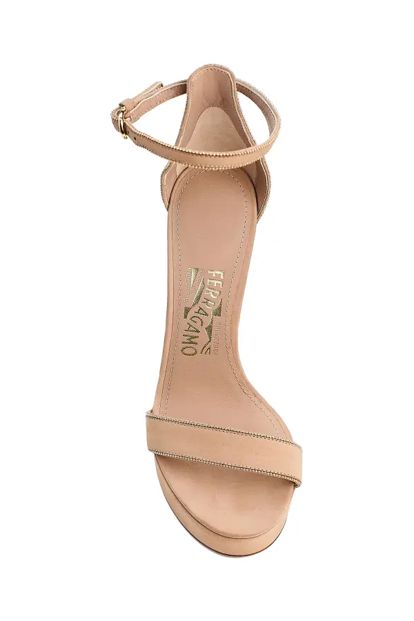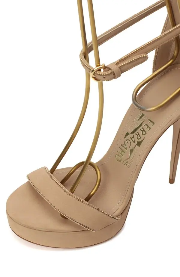 Босоножки выполнены из гладкой кожи в нюдовом оттенке: высокая шпилька уравновешена платформой, визуально вытягивая силуэт. Узкий ремешок на щиколотке с пряжкой фиксирует посадку и обеспечивает комфортное прилегание. Лаконичная перемычка спереди подчёркивает изящность стопы и легко вписывается в вечерние образы.