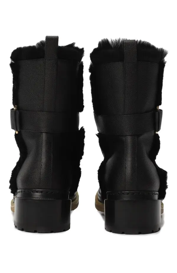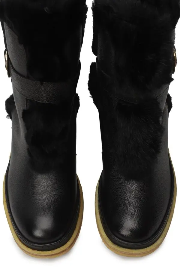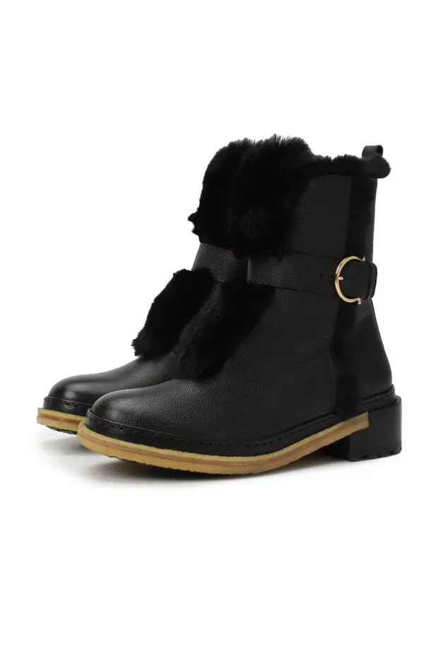 Ботинки Salvatore Ferragamo выполнены из чёрной фактурной кожи с мягкими меховыми вставками, создающими уютный акцент. Ремень с золотистой пряжкой подчёркивает фирменный стиль бренда. Контрастная подошва и устойчивый каблук обеспечивают комфорт и практичность в холодное время года.