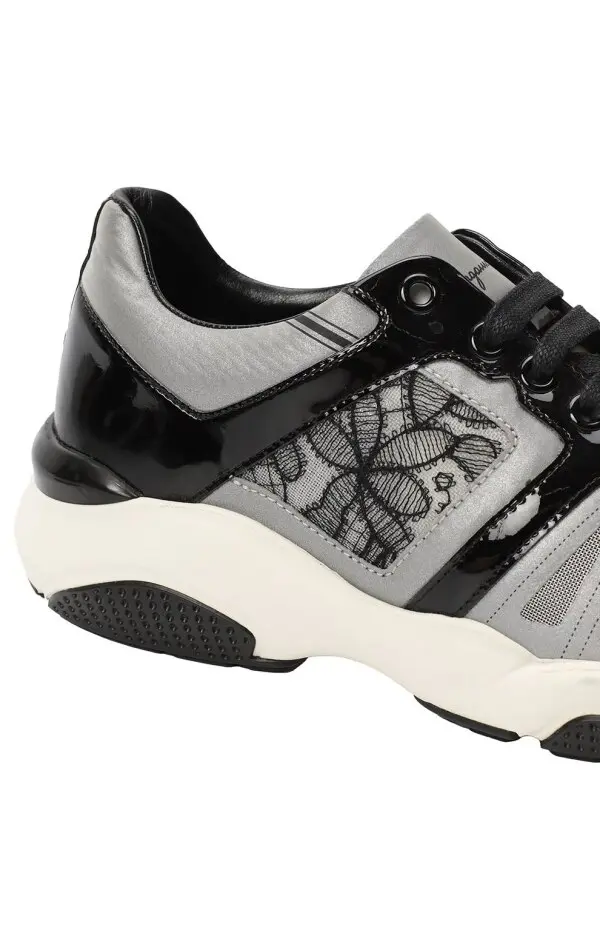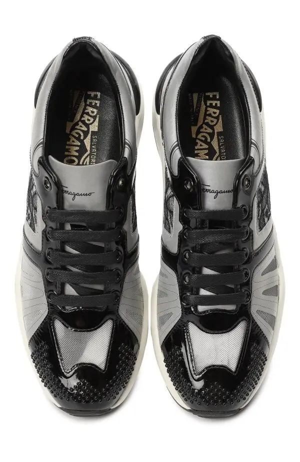 Кроссовки Gingi Salvatore Ferragamo сочетают спортивный силуэт с элегантной итальянской эстетикой. Модель выполнена из сочетания лакированной кожи, текстиля и кружева, создающего утончённый контраст фактур. Акцент на носке украшен мелкими декоративными элементами, придающими блеск. Лёгкая рельефная подошва обеспечивает комфорт и устойчивость при ходьбе. Стильная пара для динамичного городского образа.