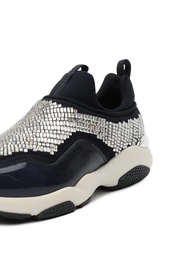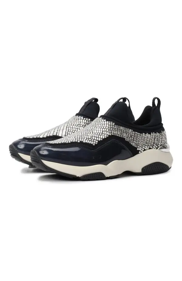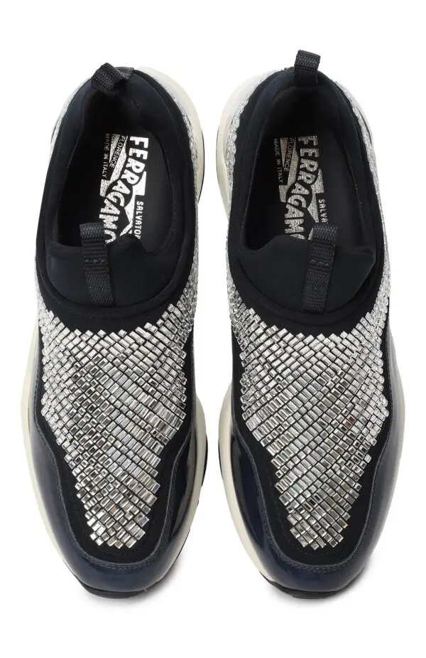 Кроссовки Giolly от Salvatore Ferragamo сочетают спортивный комфорт с ярким дизайнерским акцентом: верх выполнен из текстиля и лакированной кожи, дополнен эффектными серебристыми мозаичными вставками, а массивная двухцветная подошва обеспечивает удобство и современный стиль.