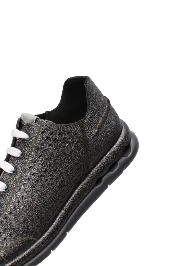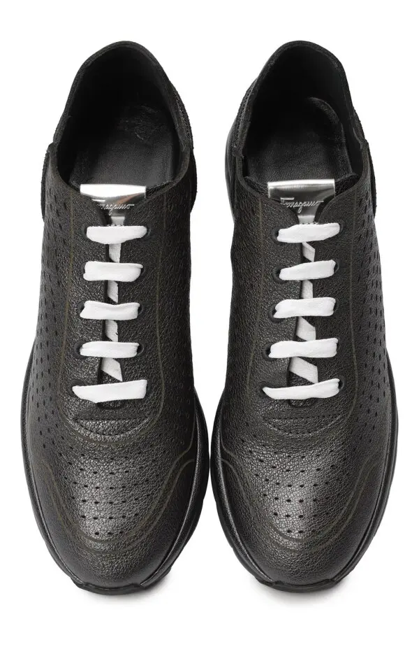 Кроссовки Gils от Salvatore Ferragamo выполнены из мягкой перфорированной кожи металлического оттенка, обеспечивая лёгкость и вентиляцию, дополнены контрастной чёрной подошвой с фирменными амортизирующими вставками и белыми шнурками для современного акцента. Модель сочетает в себе спортивный комфорт и элегантный минимализм, идеально подходя для динамичного городского стиля.