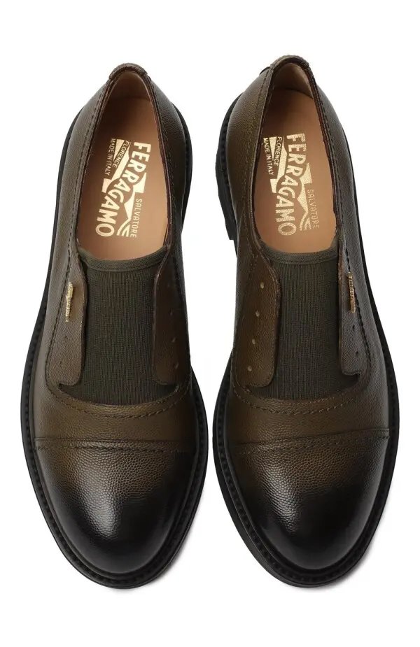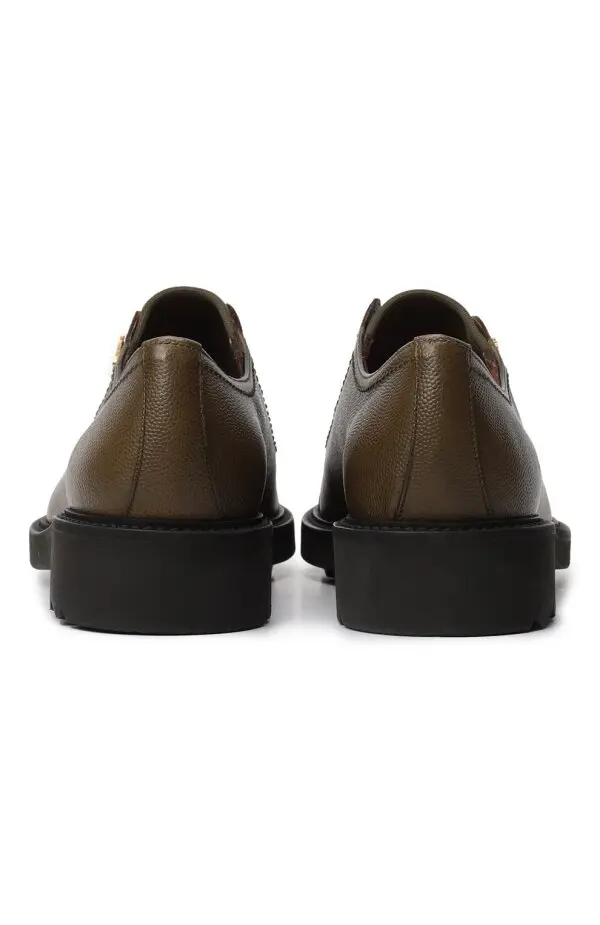 Дерби от Salvatore Ferragamo выполнены из мягкой зернистой кожи оливкового оттенка с глянцевым мыском. Эластичные вставки добавляют удобства, а утолщённая подошва с протектором делает модель практичной. Лаконичный силуэт и золотистая подпись бренда подчеркивают премиальный характер пары.