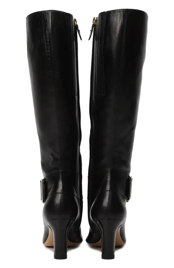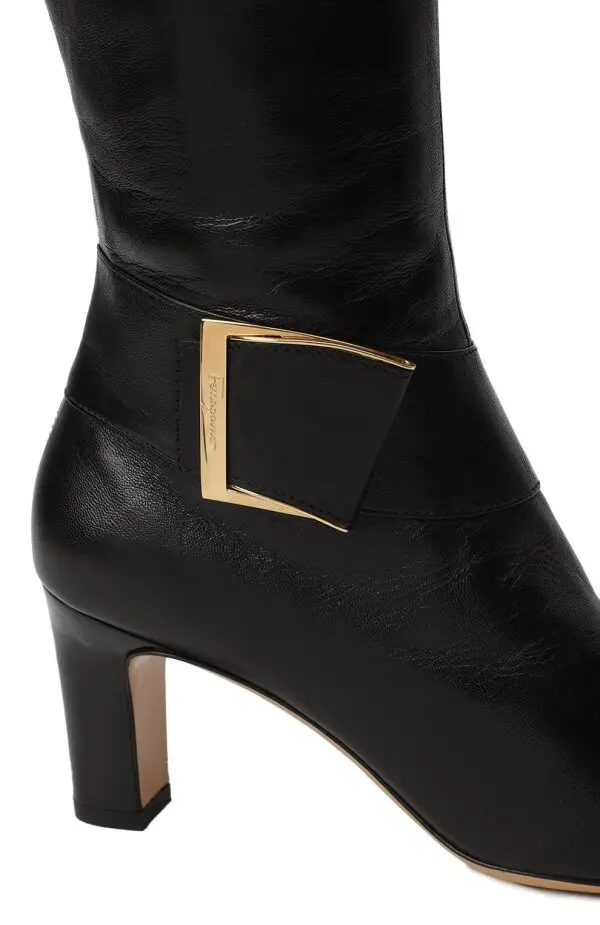 Сапоги Gancini Salvatore Ferragamo из гладкой черной кожи. Элегантная модель с акцентной пряжкой в форме фирменного мотива Gancini в золотистом тоне. Умеренный каблук придаёт женственный силуэт и делает пару удобной для повседневного ношения.