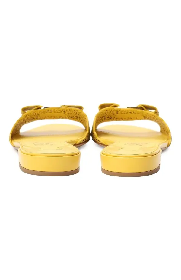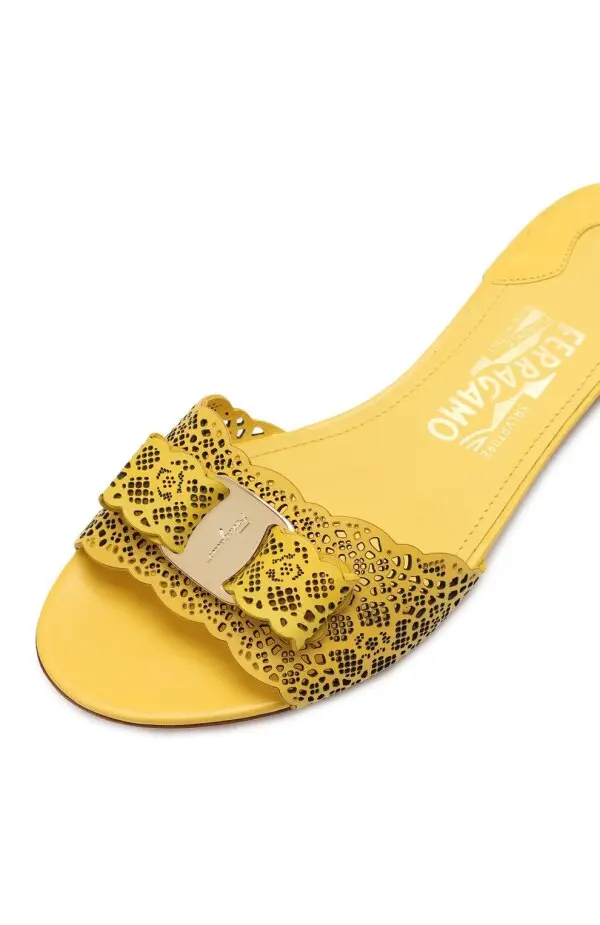 Мюли Gil Salvatore Ferragamo выполнены из гладкой жёлтой кожи с лазерной перфорацией, создающей изящный ажурный эффект. Фирменный акцент — крупный бант Vara с металлической вставкой — придаёт модели утончённый характер. Низкий устойчивый каблук и мягкая кожаная стелька обеспечивают комфорт при носке. Идеальный выбор для летних образов в духе итальянской женственности.