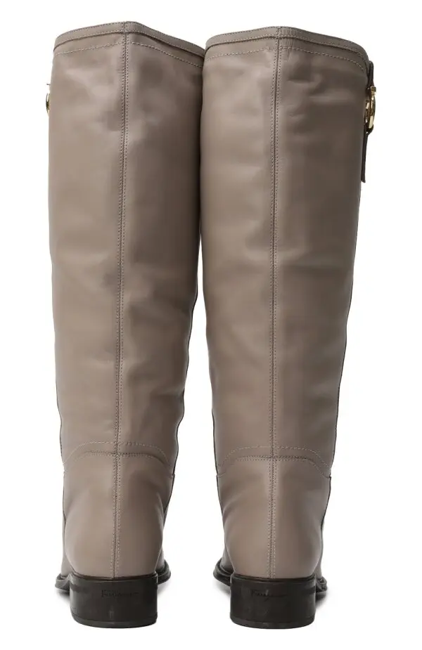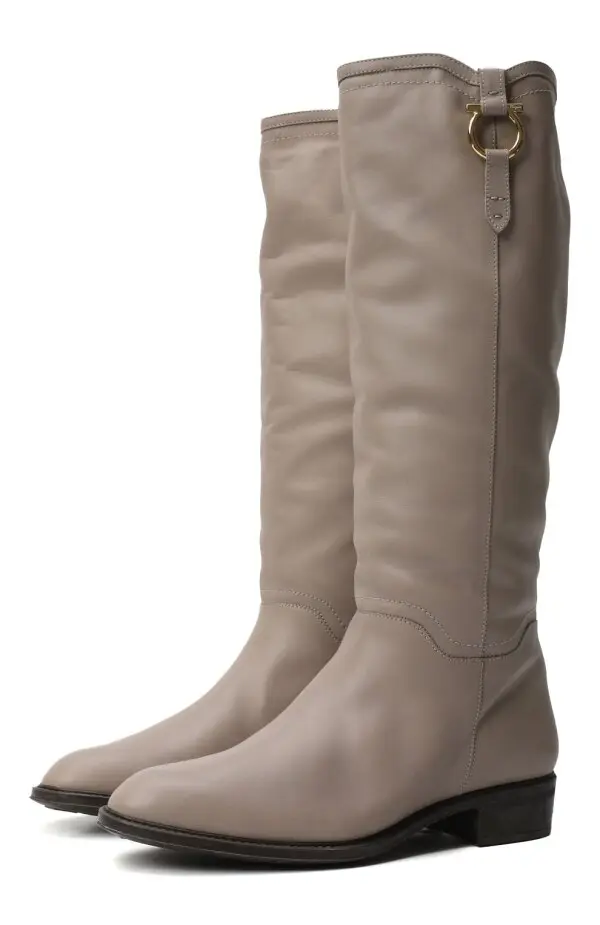 Сапоги Salvatore Ferragamo из мягкой кожи светло-бежевого оттенка. Лаконичный силуэт с невысоким каблуком дополняет элегантная деталь — фирменное кольцо Gancini в золотистом тоне, отражающее утончённую эстетику бренда.