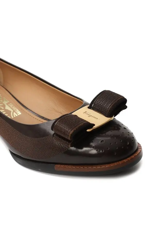Туфли Vara Salvatore Ferragamo — культовая модель бренда, воплощающая элегантность и комфорт. Пара выполнена из гладкой кожи глубокого коричневого оттенка, дополнена фирменным бантом из гросгрейна с золотистой пряжкой с логотипом. Невысокий устойчивый каблук обеспечивает удобство, а классический силуэт делает обувь универсальной для деловых и повседневных образов.