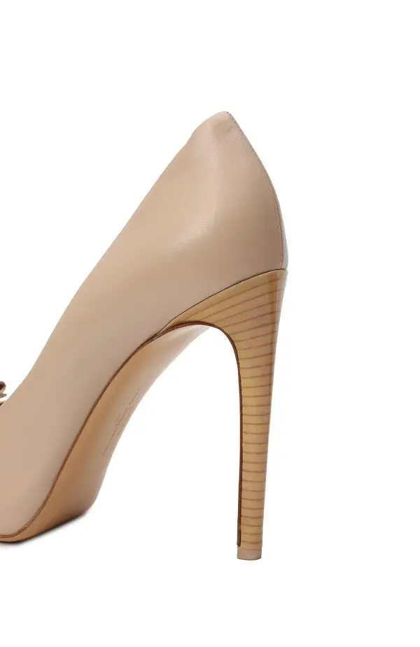 Туфли Rilly от Salvatore Ferragamo выполнены из гладкой бежевой кожи, сочетающей в себе элегантность и универсальность. Модель отличается изящным округлым мыском и высоким каблуком-шпилькой, визуально удлиняющим силуэт. Фирменным акцентом служит культовый бант Vara из тканой ленты с золотистой пластиной, придающий образу характерный для бренда утончённый шарм. Внутренняя отделка из натуральной кожи обеспечивает комфорт, а аккуратная подошва делает обувь практичной для повседневного и вечернего выхода.