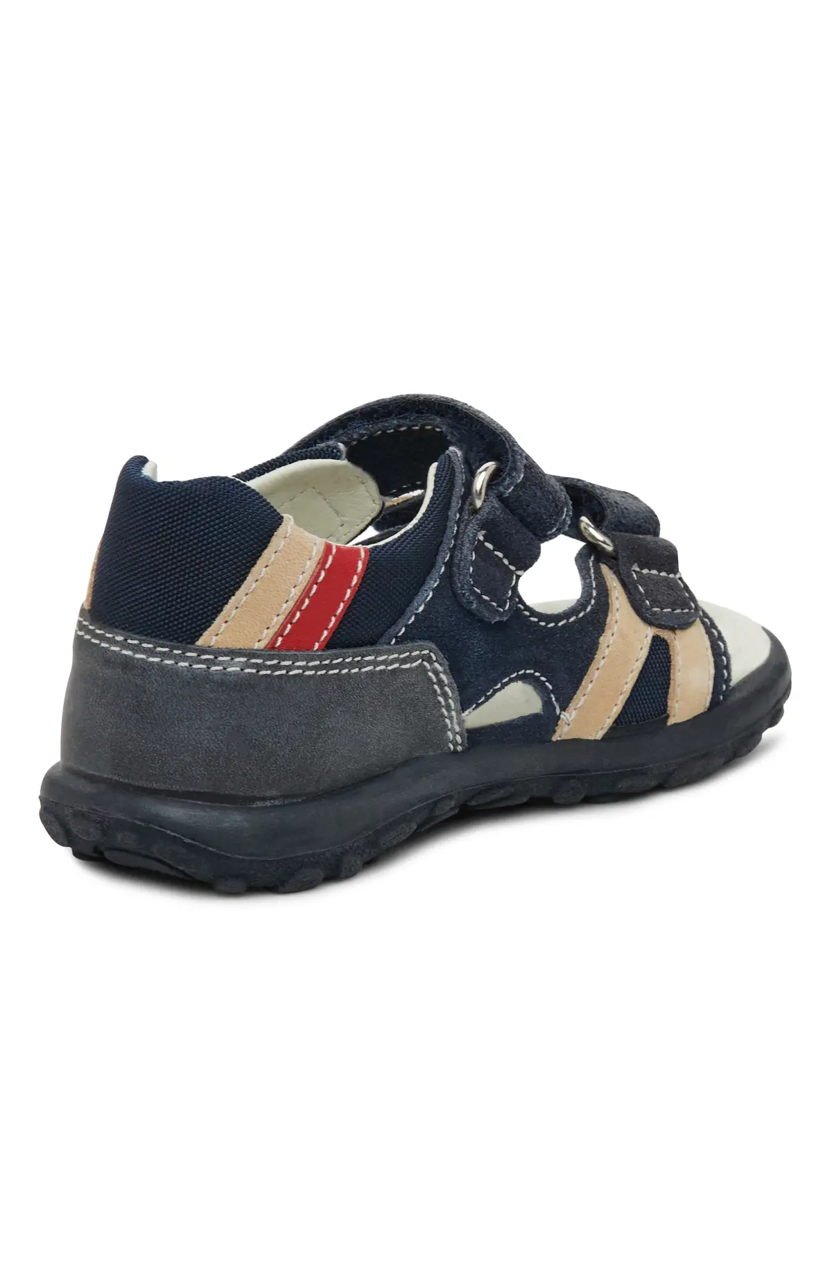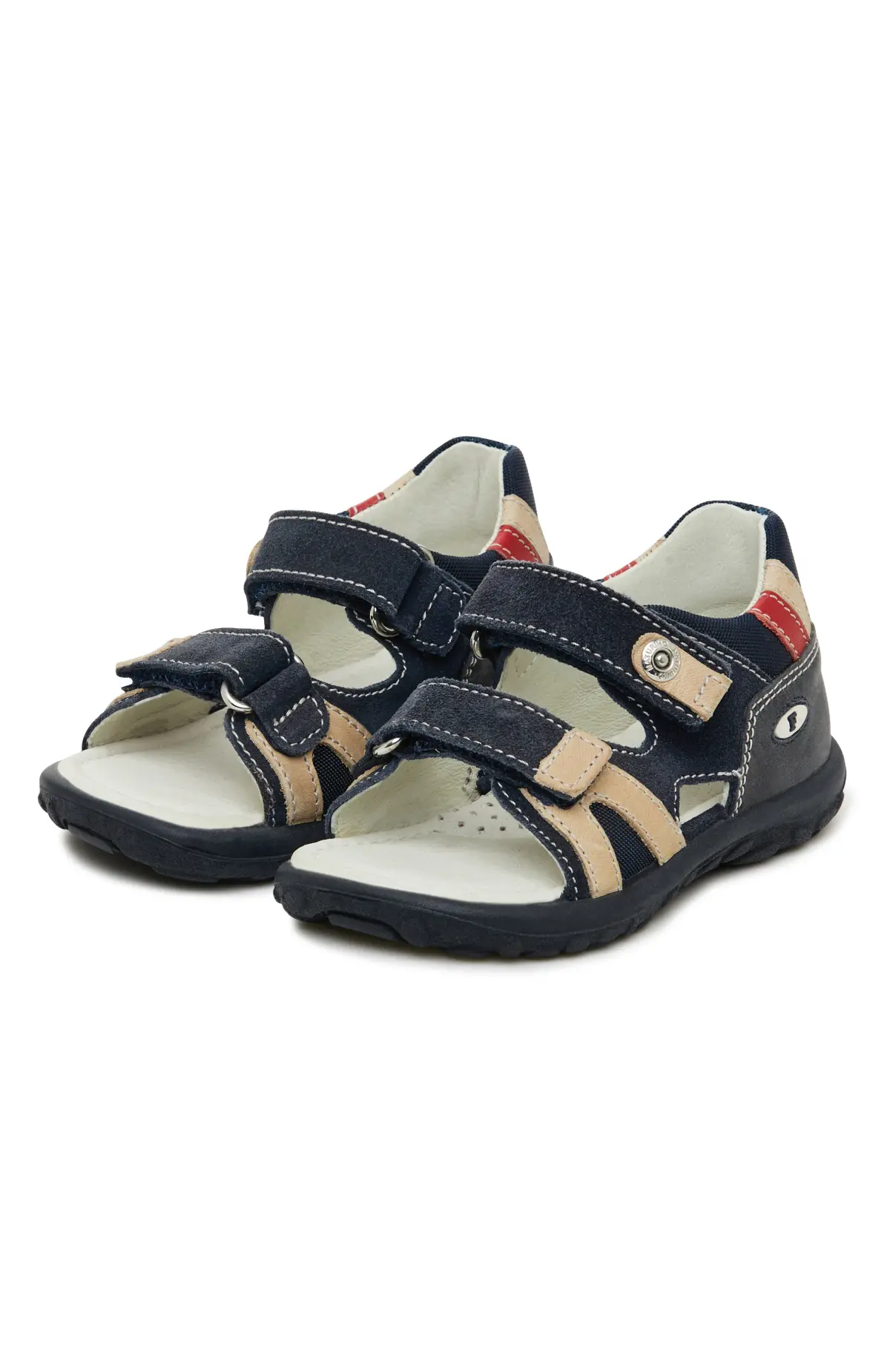 Сандалии из мягкой кожи с бархатистыми замшевыми вставками и контрастной строчкой в оттенках темно-синего, бежевого и красного. Два велкро-ремешка позволяют быстро фиксировать посадку, закрытый задник поддерживает пятку. Анатомическая стелька и гибкая рифлёная подошва обеспечивают комфорт и хорошее сцепление на прогулках. Отличный выбор на каждый день в тёплое время года.