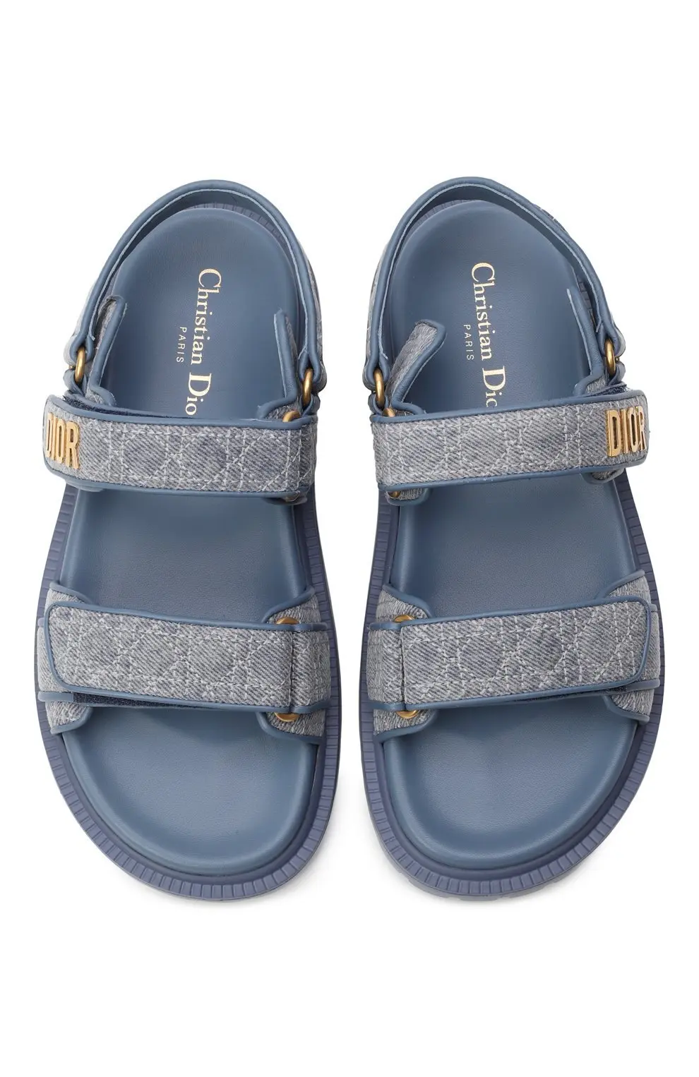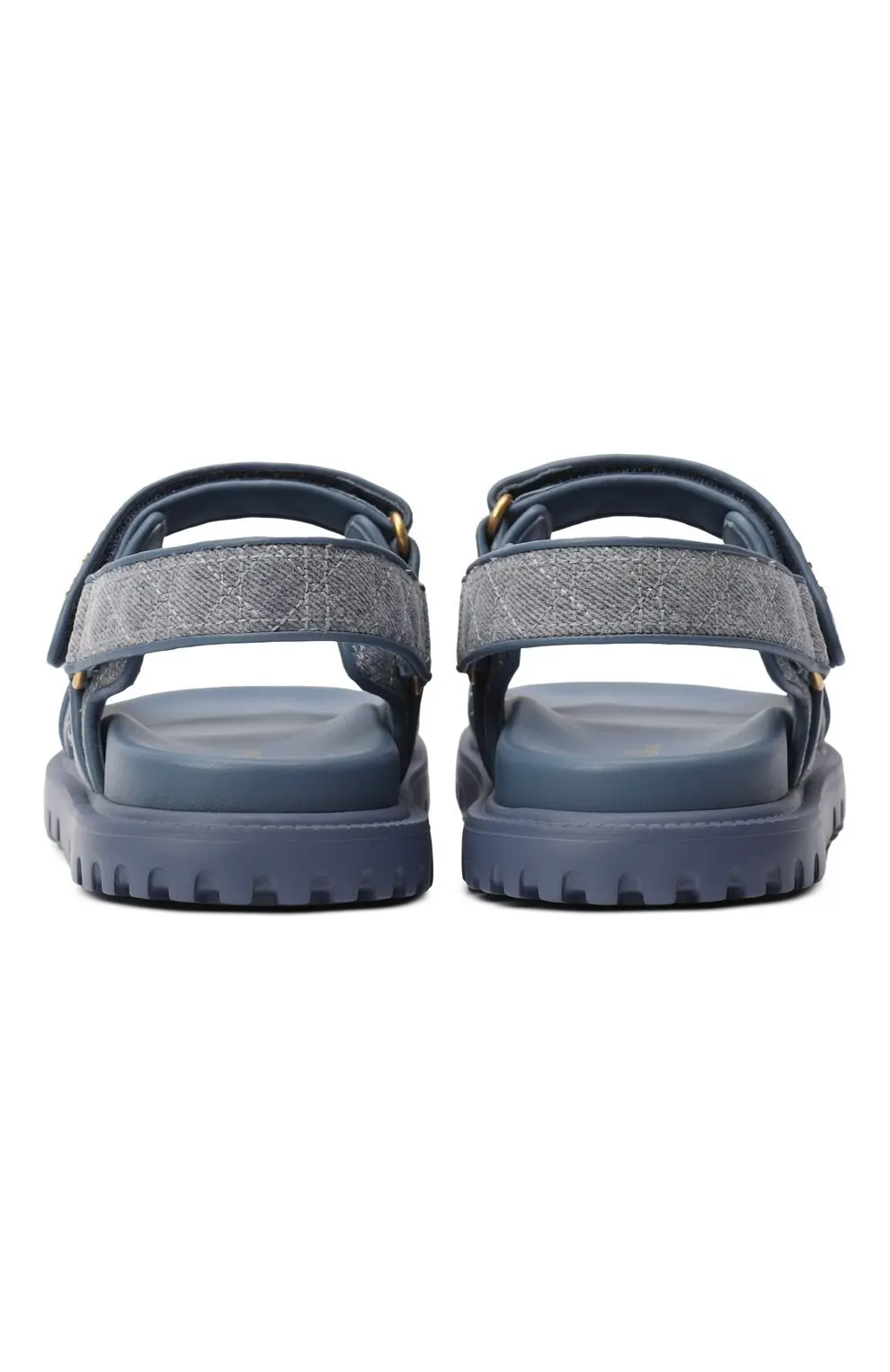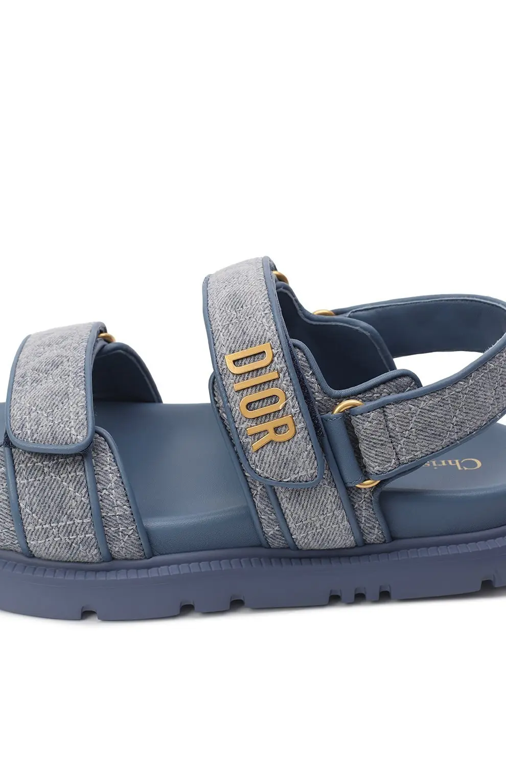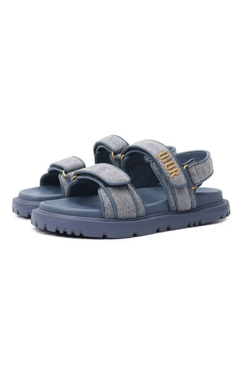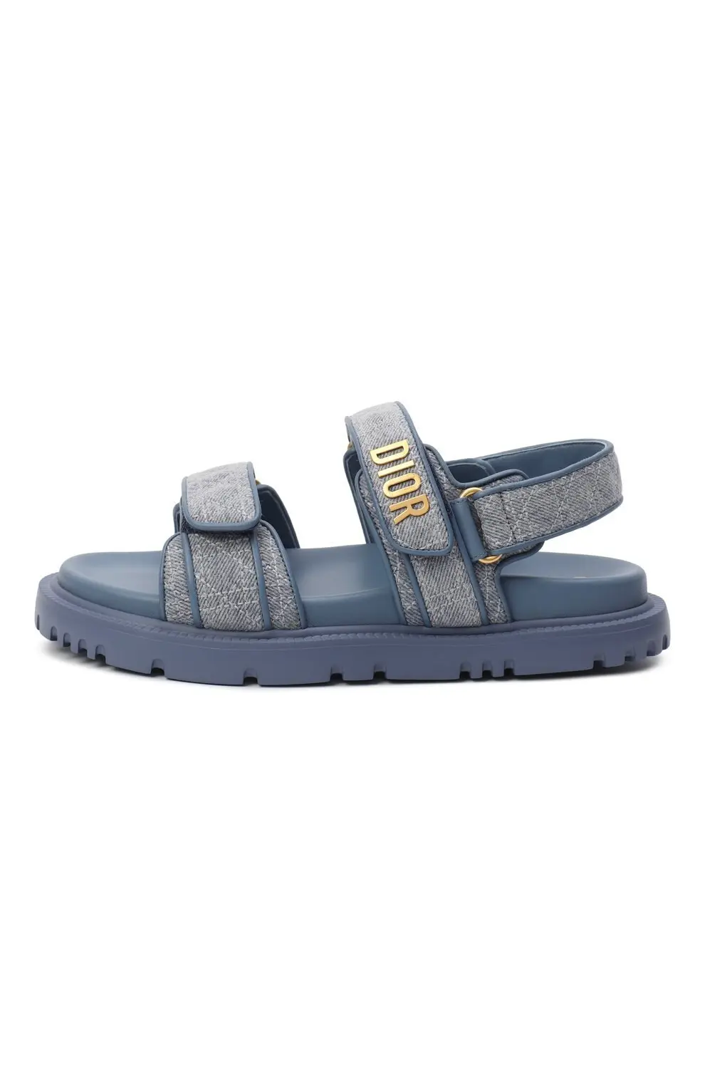 Сандалии DiorAct от Dior в небесно-голубом оттенке выполнены из комбинации гладкой кожи и текстиля, создавая современный и лёгкий образ. Широкие ремешки с застёжками на липучке обеспечивают комфорт и регулируемую посадку. Золотистый логотип DIOR на боковом ремешке добавляет изысканный акцент. Анатомическая стелька и массивная рифлёная подошва делают модель удобной для повседневной носки, сочетая стиль и практичность.