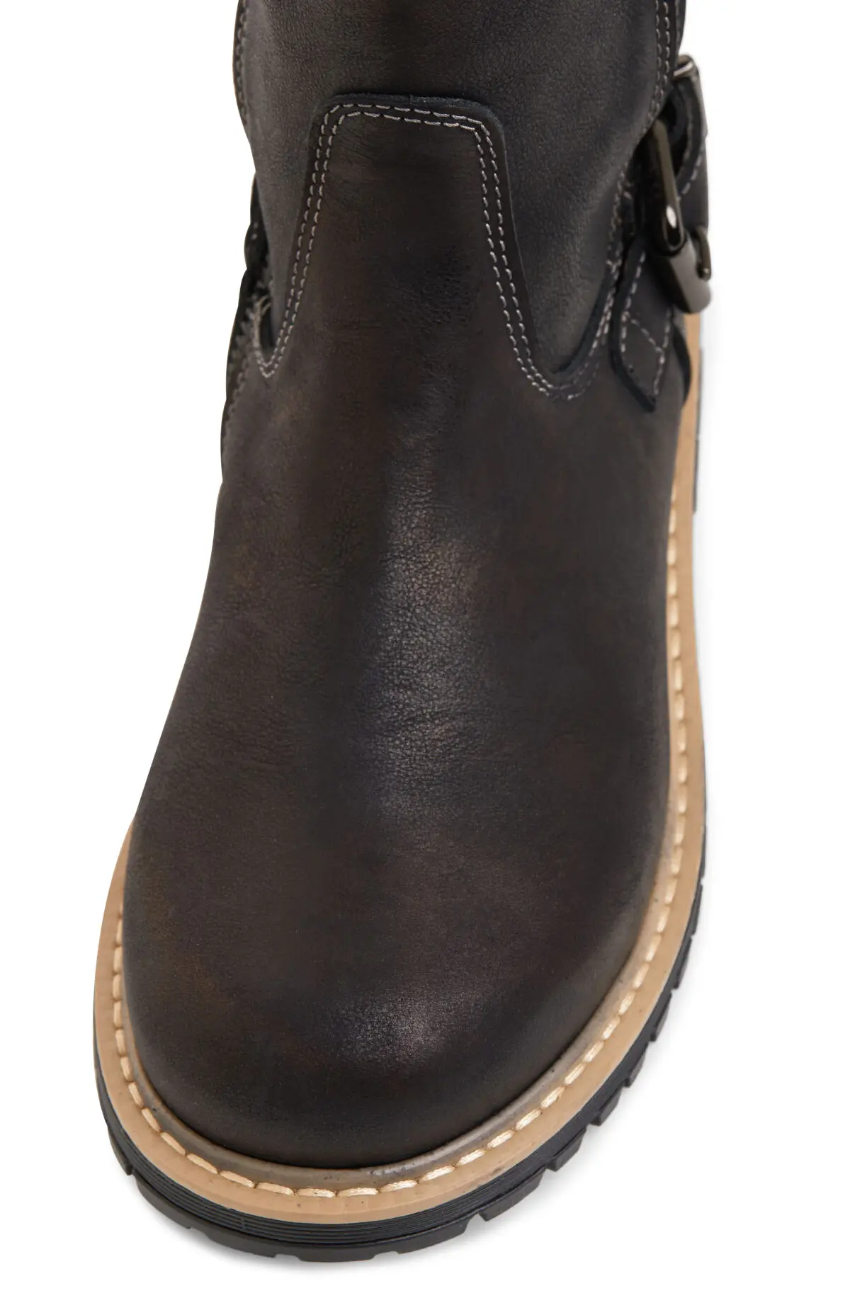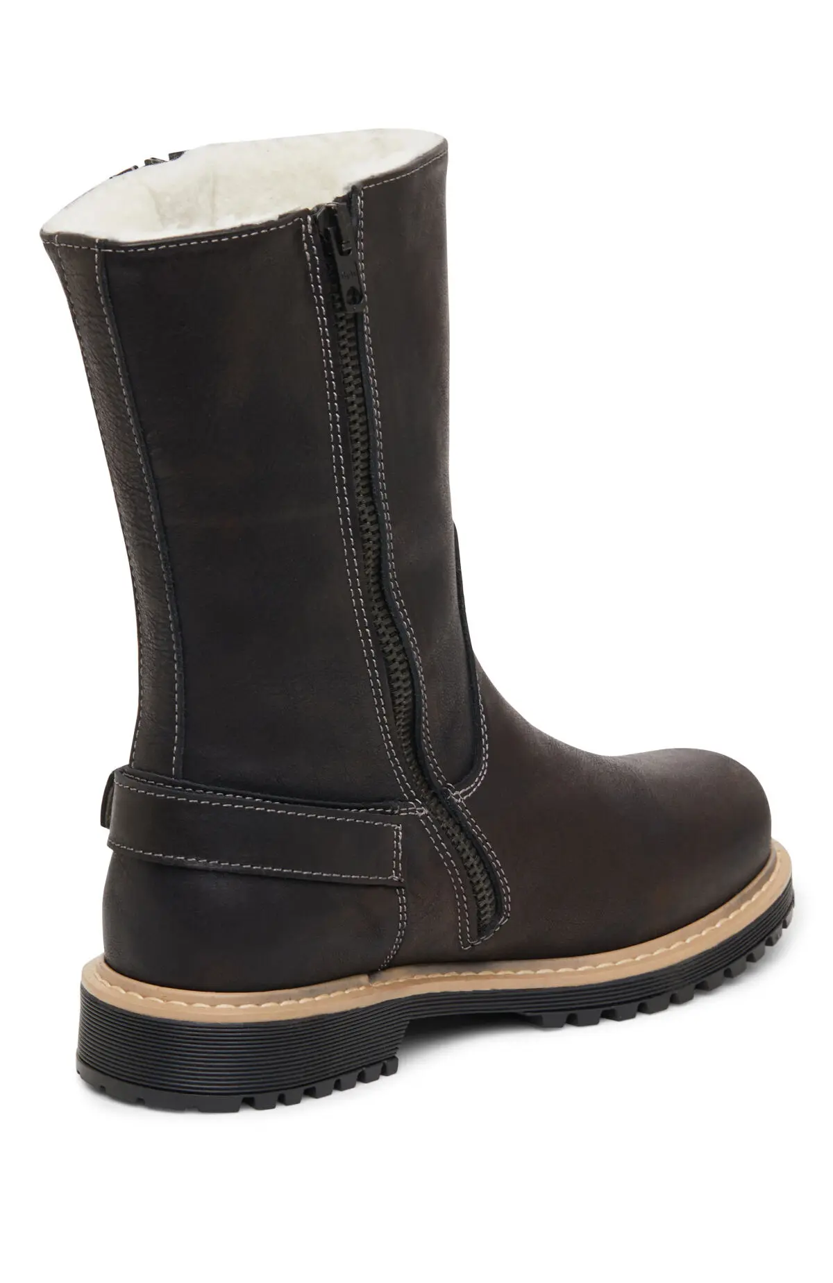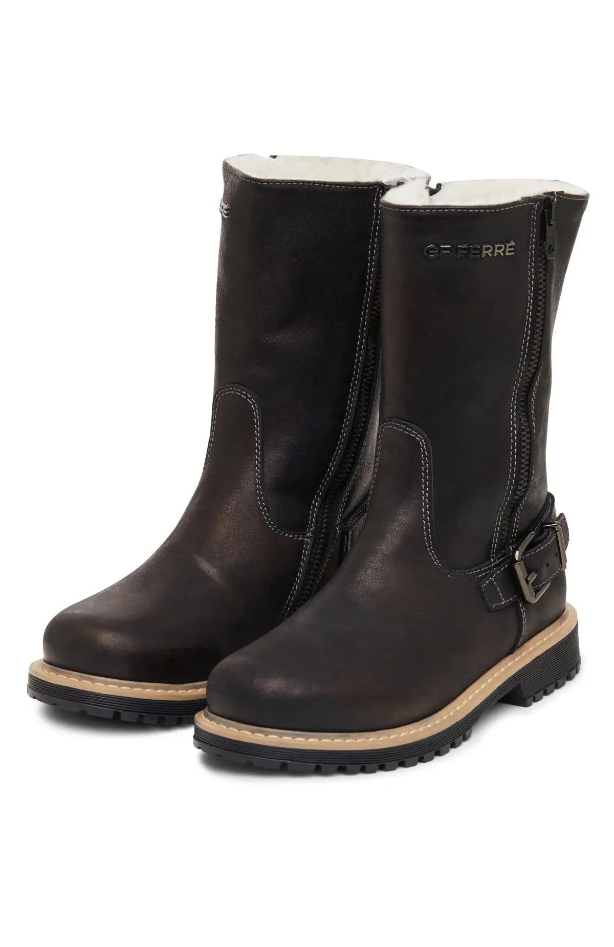 Модель выполнена из гладкой тёмной кожи с лёгким матовым блеском и контрастной отстрочкой. Утеплённая внутренняя отделка, боковая молния и ремень с пряжкой обеспечивают комфортное прилегание и удобство посадки. Рельефная подошва с устойчивым протектором подчёркивает лаконичный силуэт и подходит для повседневного города.