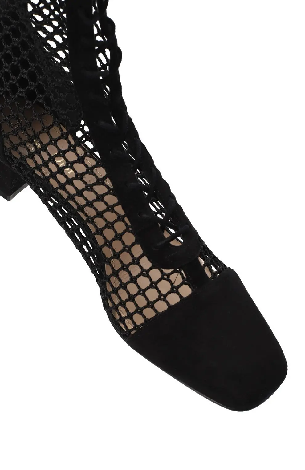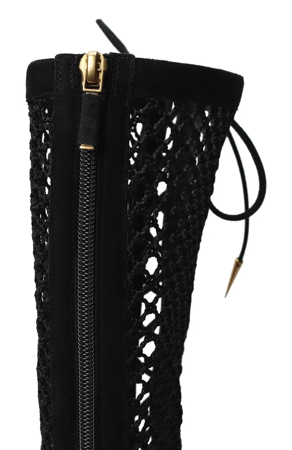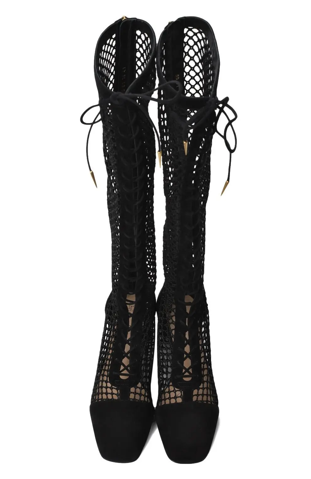Эти сапоги от Christian Dior — смелое сочетание авангардного дизайна и высокой элегантности. Модель выполнена из мягкой замши и сетчатого материала, создающего эффект легкости и воздушности, при этом сохраняя графичную структуру. Высокий голенище с открытым плетением и шнуровкой спереди украшено золотистыми акцентами на концах, что добавляет изысканности. Невысокий устойчивый каблук обеспечивает комфорт, а контраст носочной и пяточной части из замши придает обуви утончённый характер. Идеальный выбор для тех, кто ценит уникальные детали и стремится выделиться современным и женственным образом.