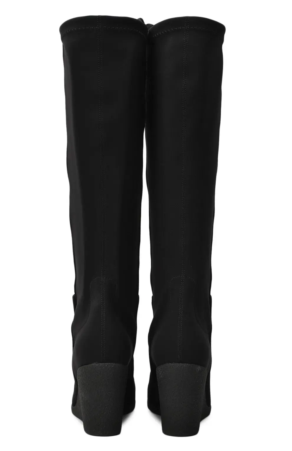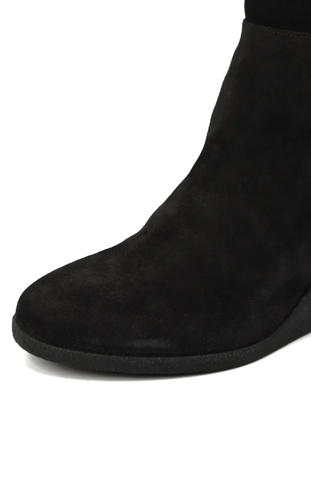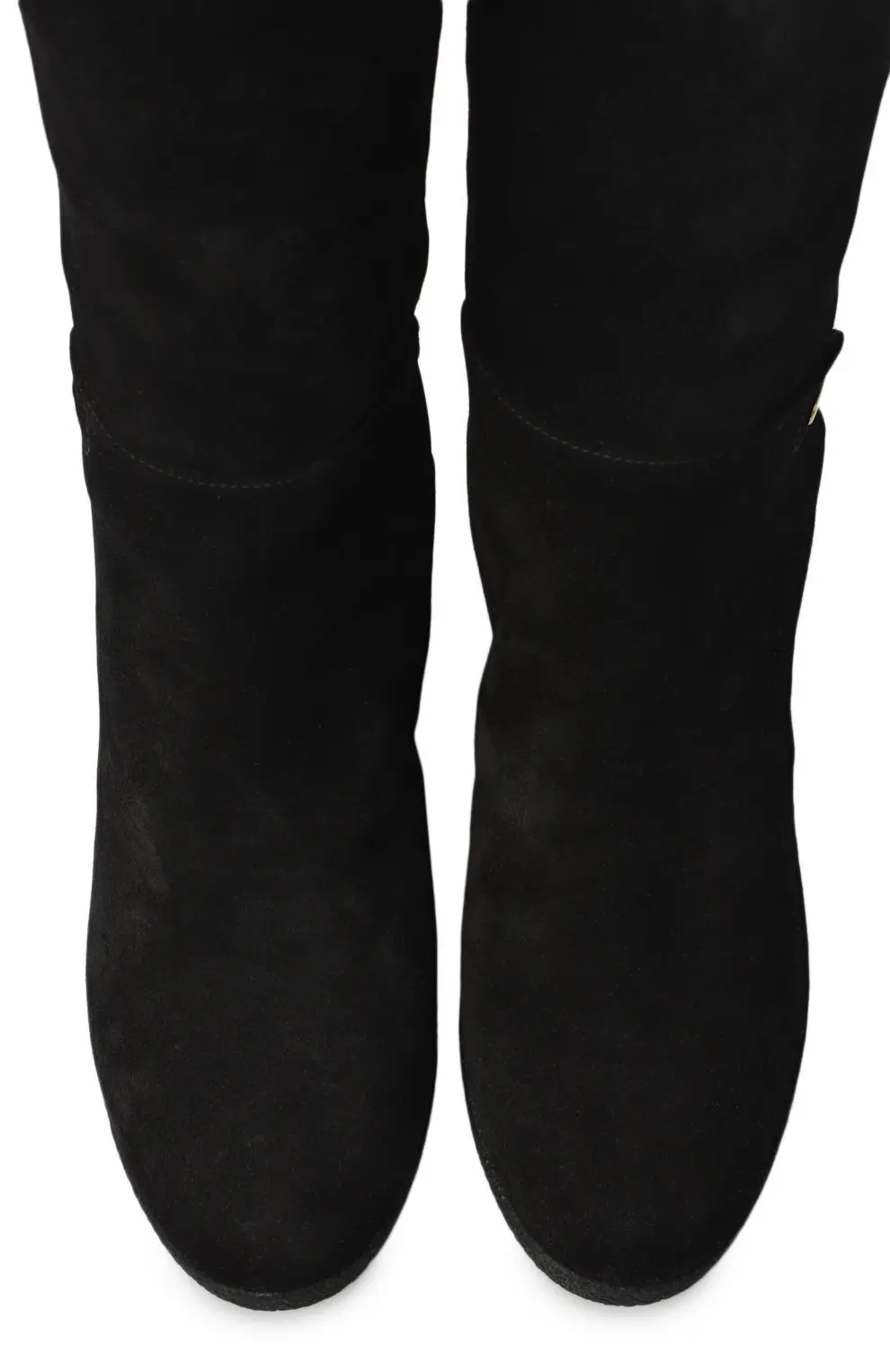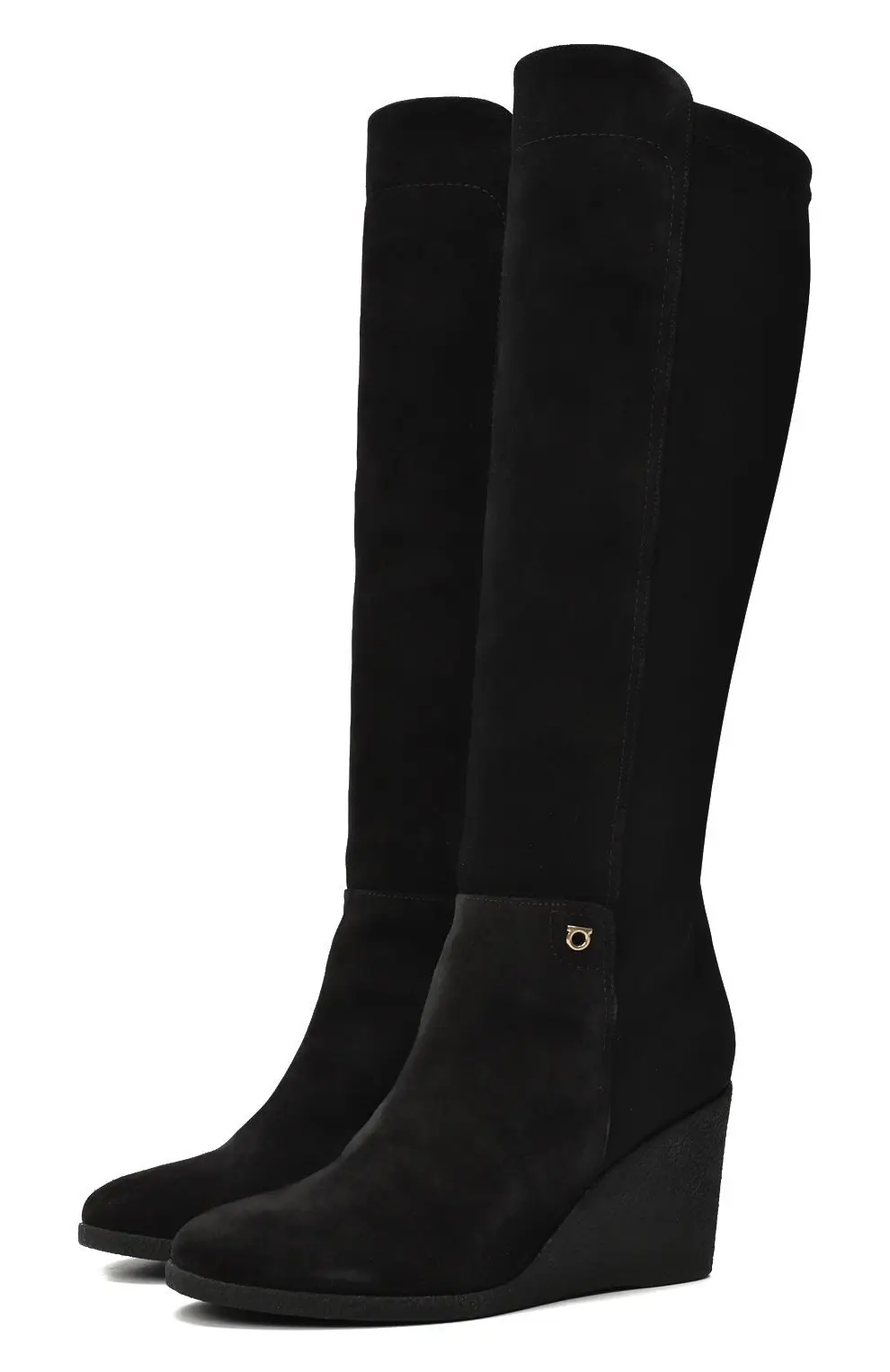 Сапоги Salvatore Ferragamo из мягкой замши глубокого черного цвета. Элегантная пара на устойчивой танкетке украшена миниатюрным металлическим логотипом Gancini, добавляющим изысканности. Универсальная модель, которая гармонично дополнит как повседневные, так и более утончённые образы.