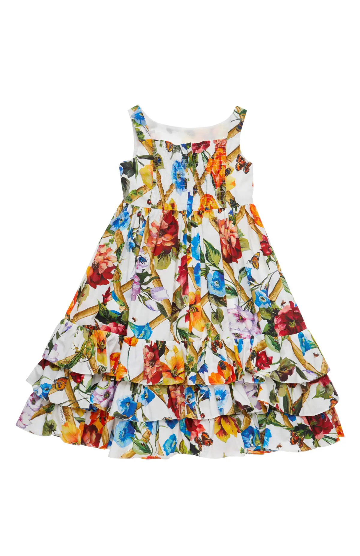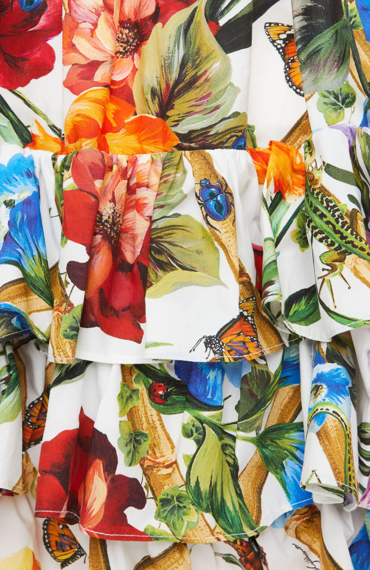 Сарафан выполнен из лёгкой ткани с ярким цветочным принтом. Многоярусная юбка с воланами придаёт силуэту объём и динамику, подчёркивая воздушный характер модели. Идеальный вариант для летних образов.