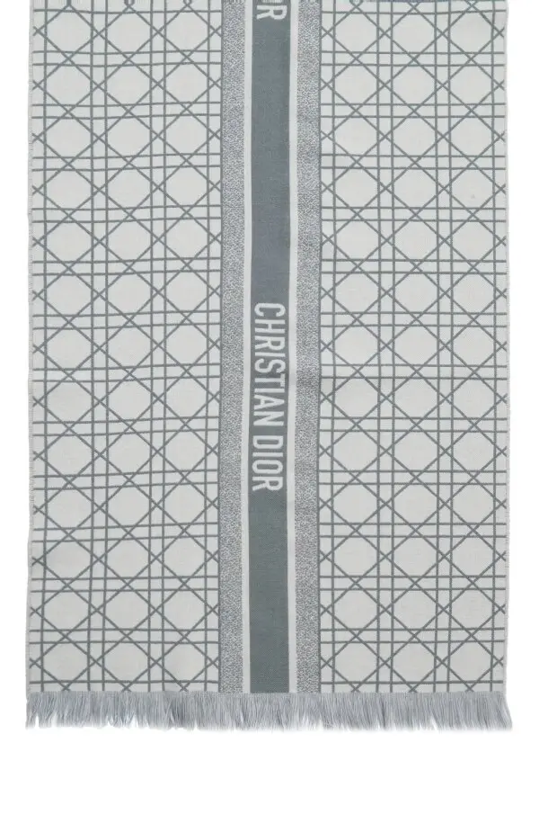 Шарф Dior выполнен из кашемира и шерсти, что обеспечивает мягкость и тепло. Дизайн украшен геометрическим узором с фирменным логотипом на краю. Лаконичная бахрома придаёт аксессуару утончённый вид.