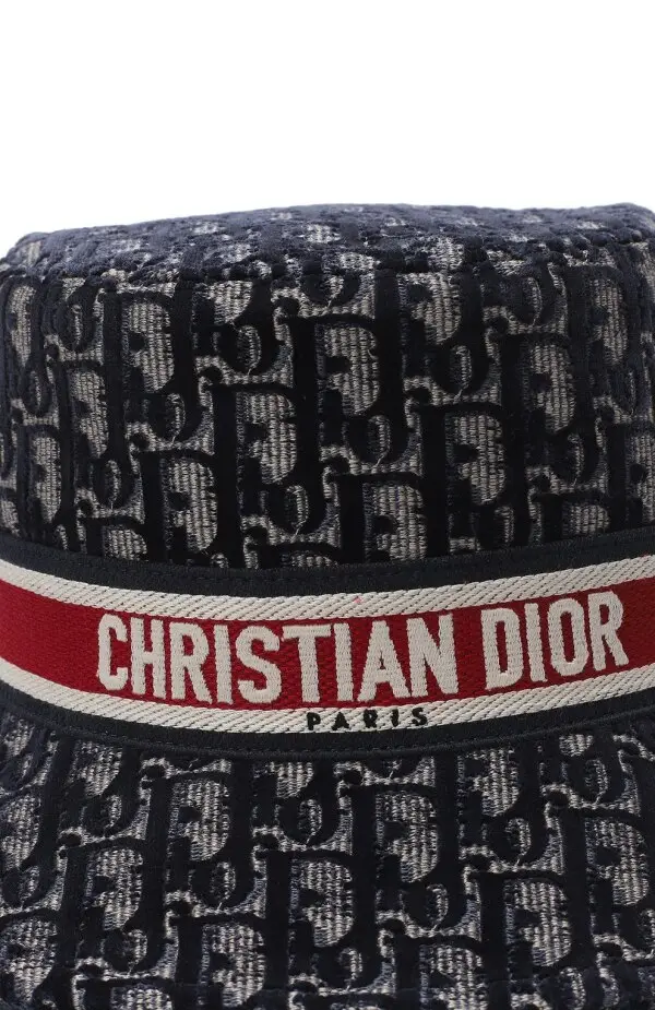 Панама Dior из мягкой вискозы и хлопка с фирменным узором Oblique. Контрастная лента с надписью Christian Dior Paris и красной полосой придаёт образу яркий акцент и подчёркивает узнаваемый стиль Дома.