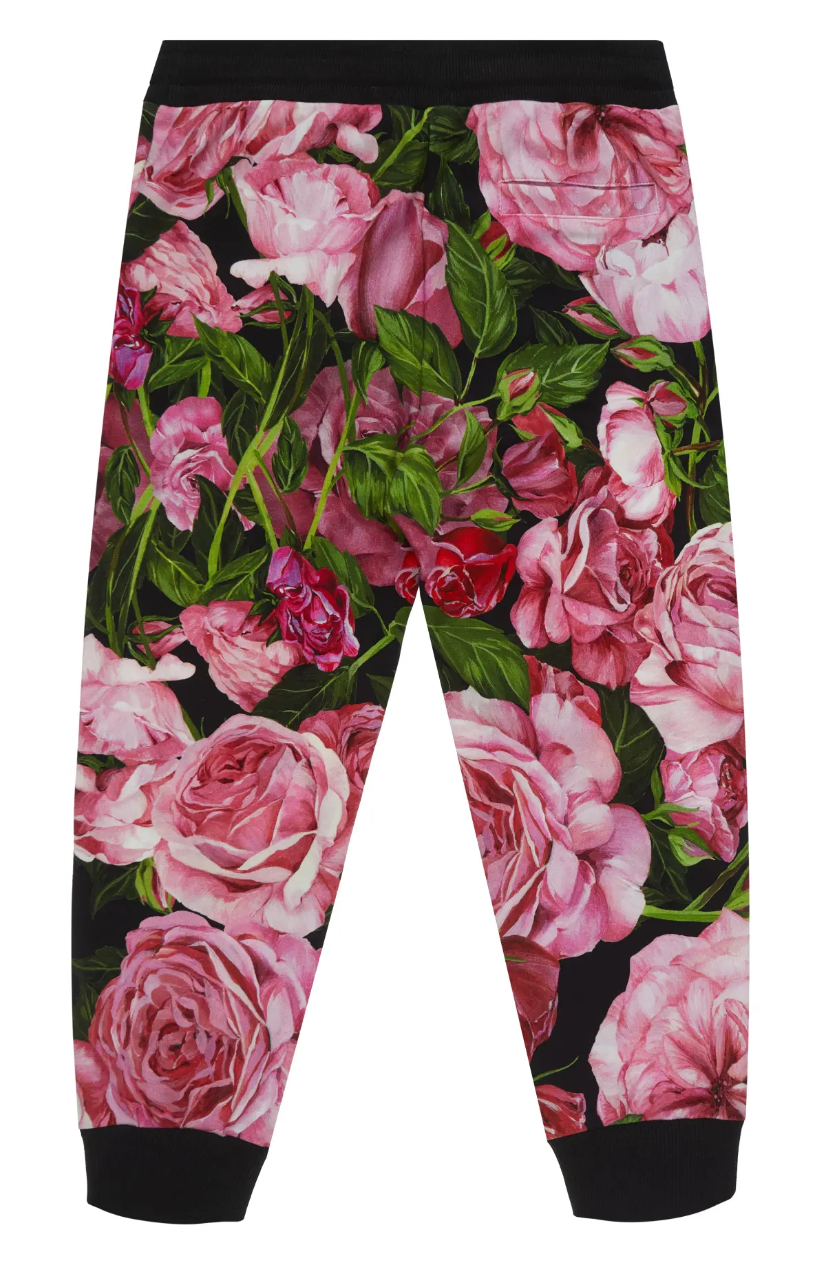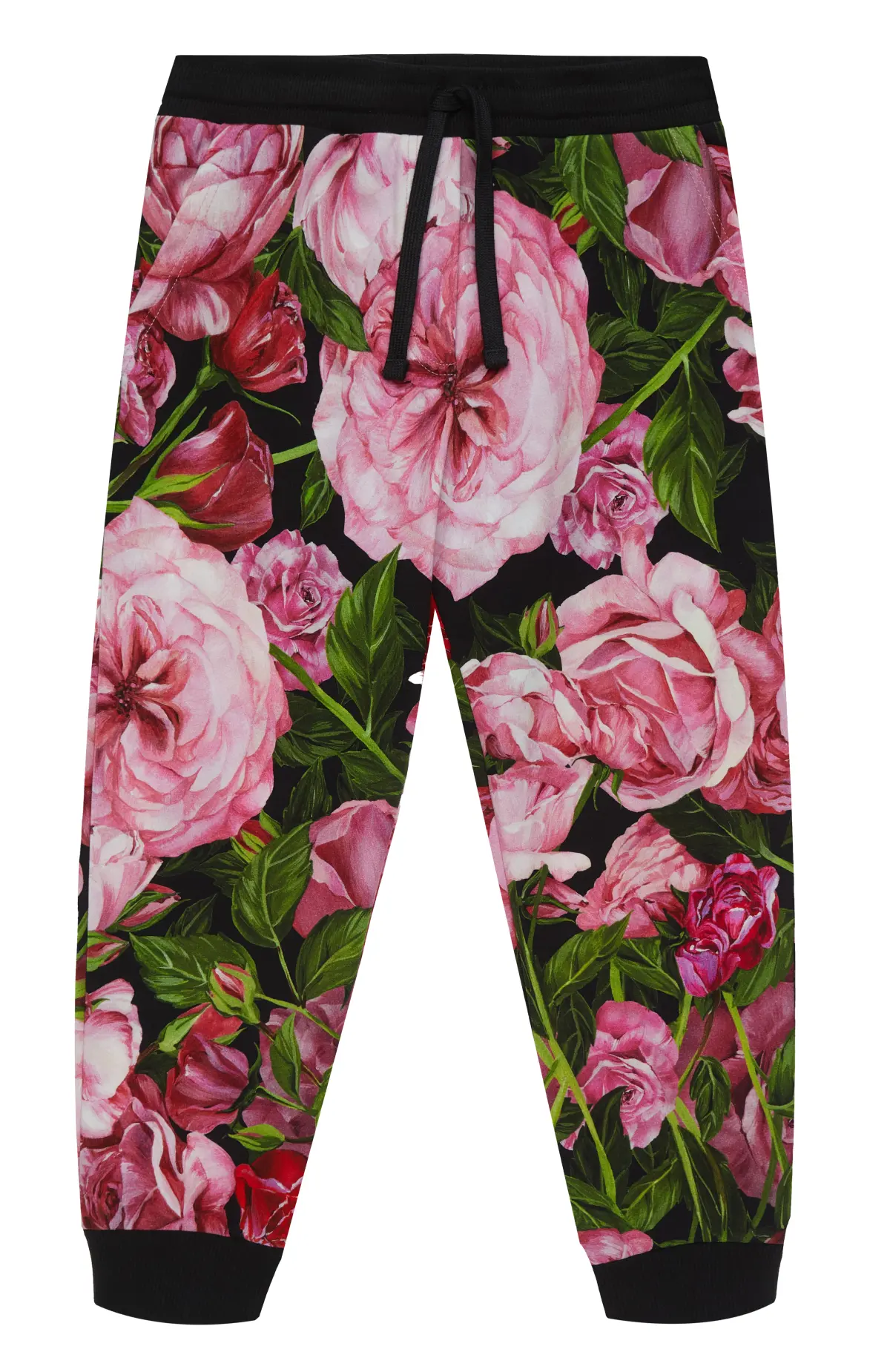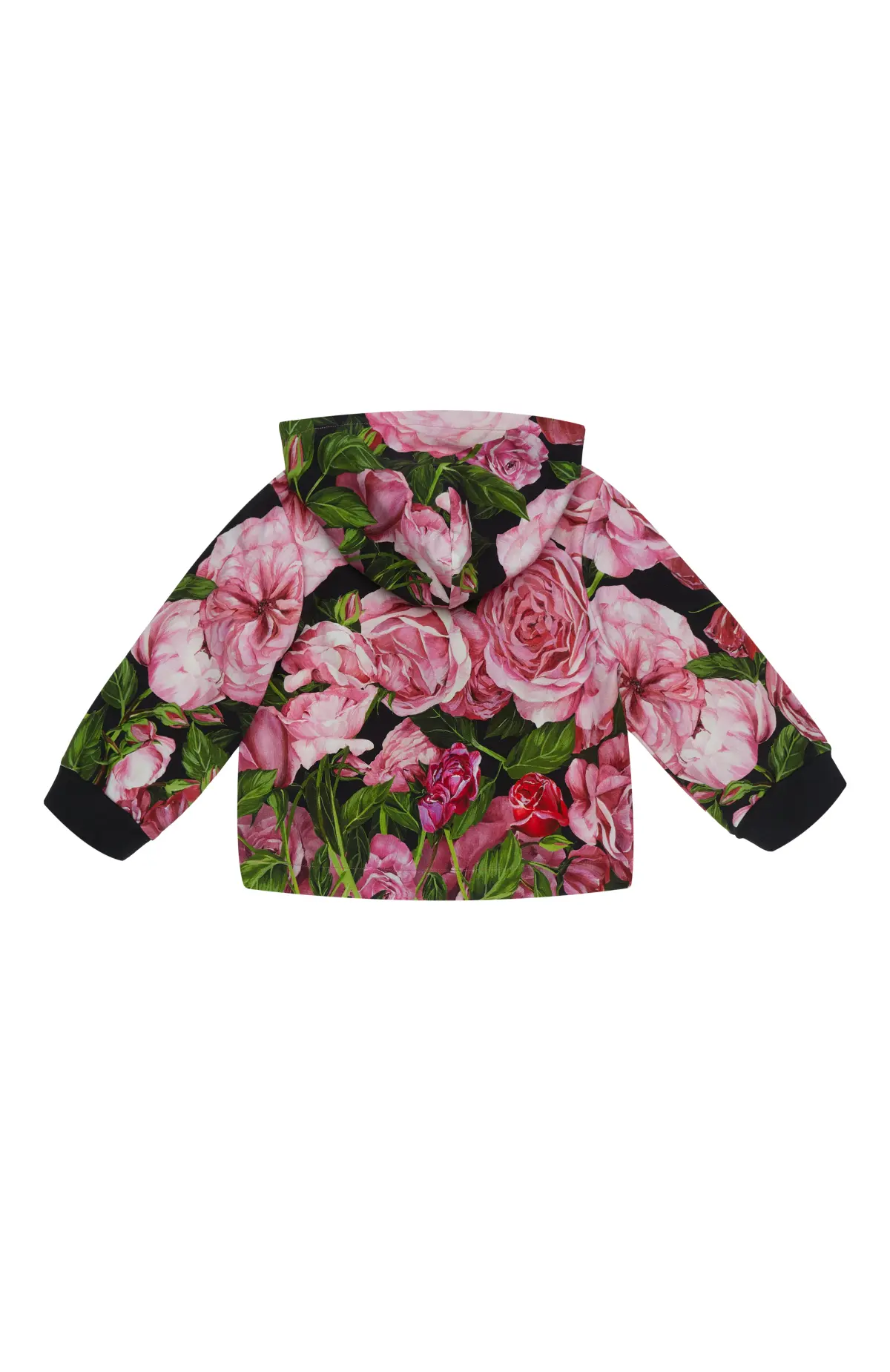 Спортивный костюм выполнен из мягкого эластичного материала с гладкой поверхностью и приятной на ощупь фактурой. Выразительный цветочный принт на контрастном фоне создаёт эффектный визуальный акцент и подчёркивает динамичный характер модели. Кофта с капюшоном и брюки с эластичным поясом обеспечивают комфортное прилегание и формируют сбалансированный силуэт.