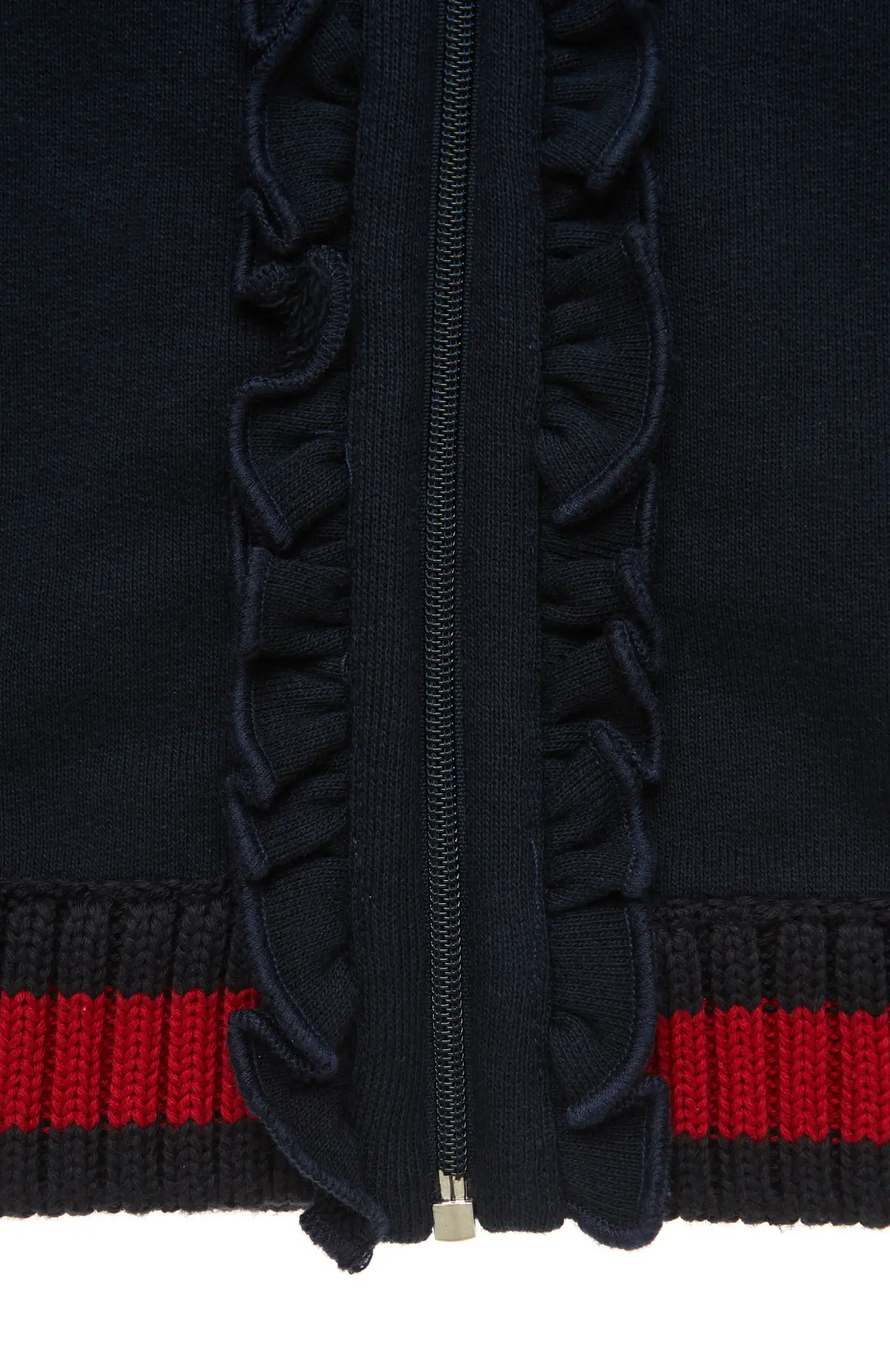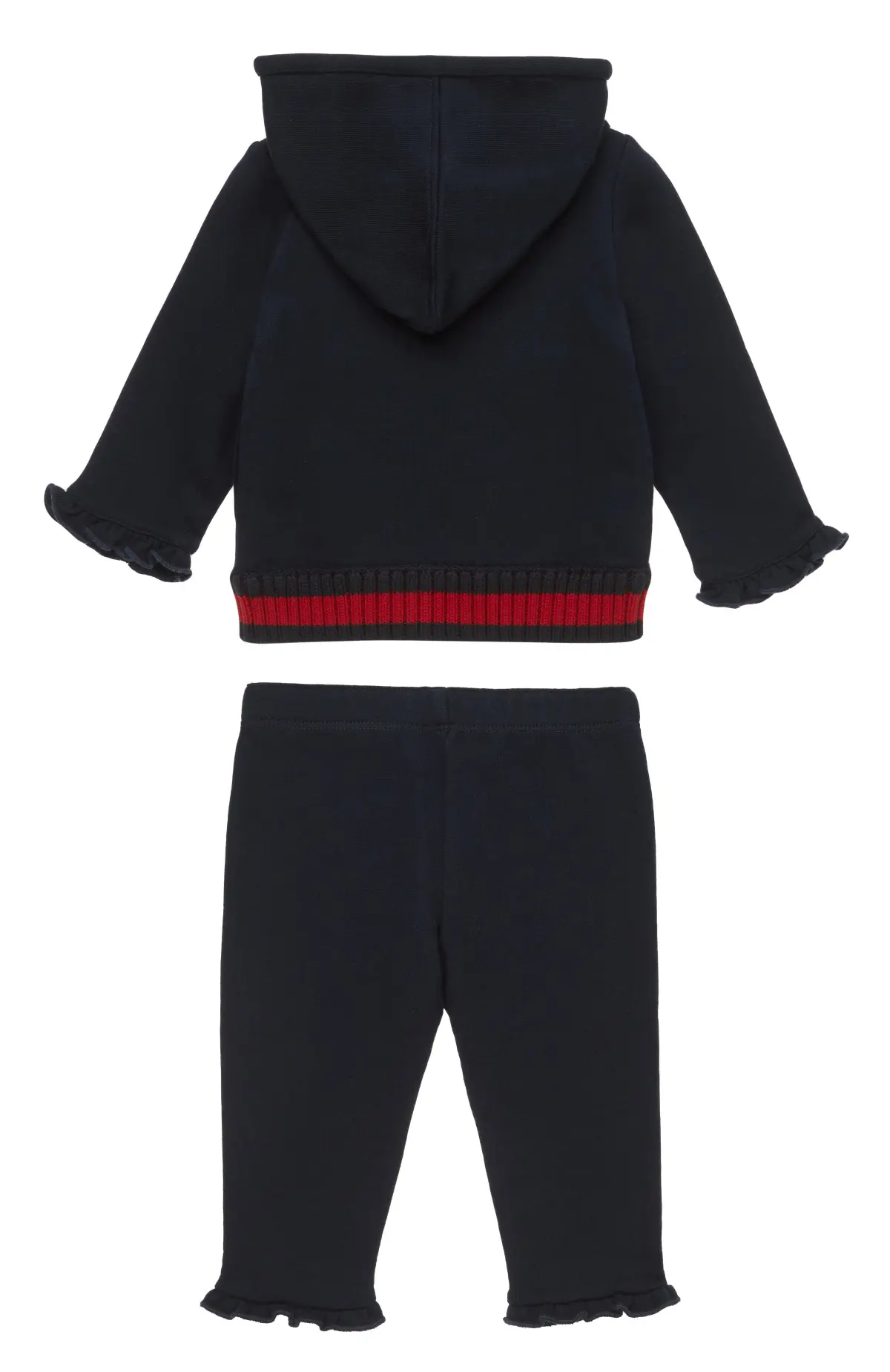 Спортивный костюм выполнен из мягкого хлопкового трикотажа с приятной гладкой фактурой. Олимпийка с капюшоном и застёжкой на молнию дополнена рюшей и контрастной отделкой, создающей выразительный акцент. Брюки обеспечивают комфортное прилегание и свободу движений, формируя аккуратный и гармоничный силуэт.