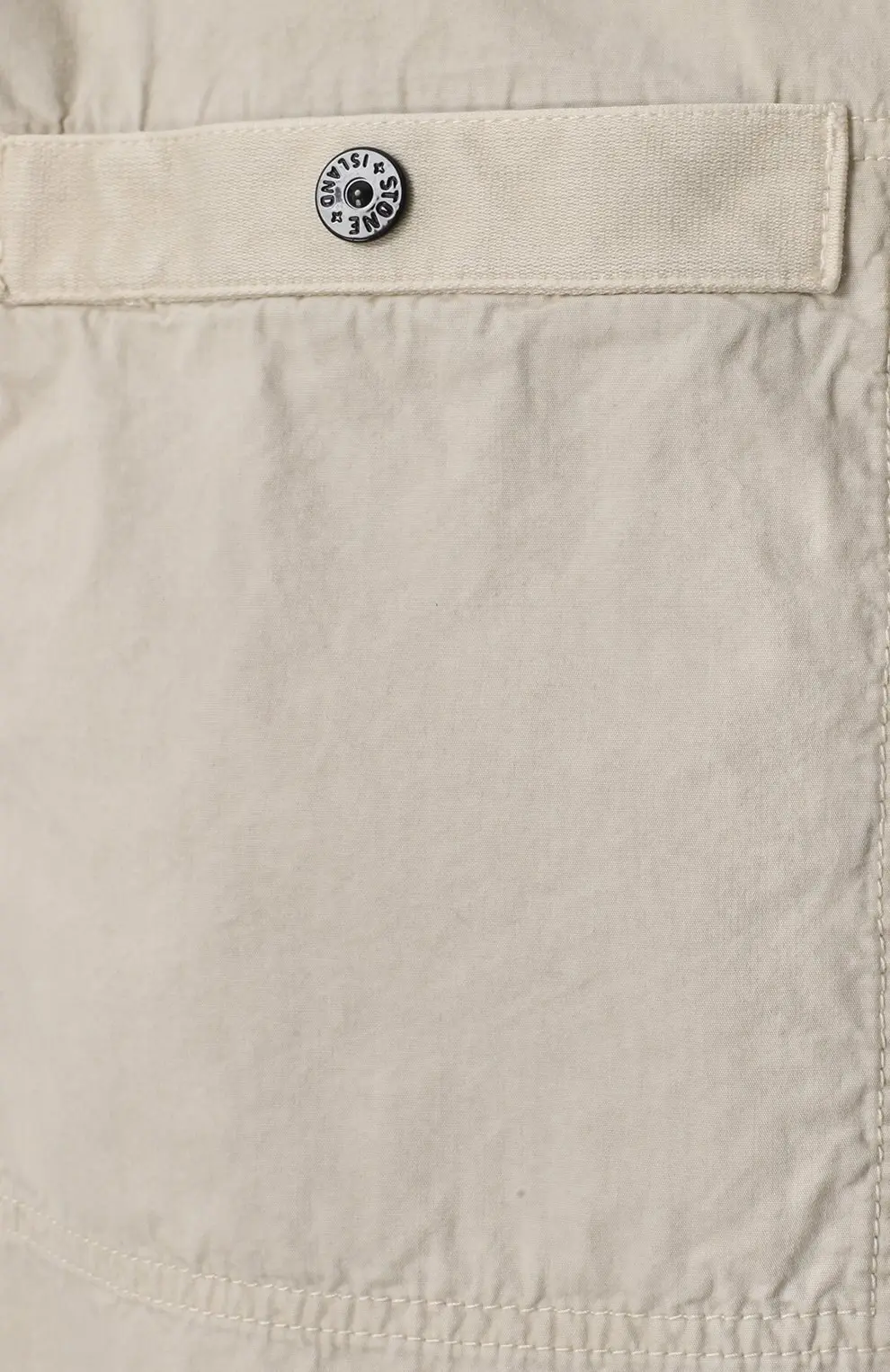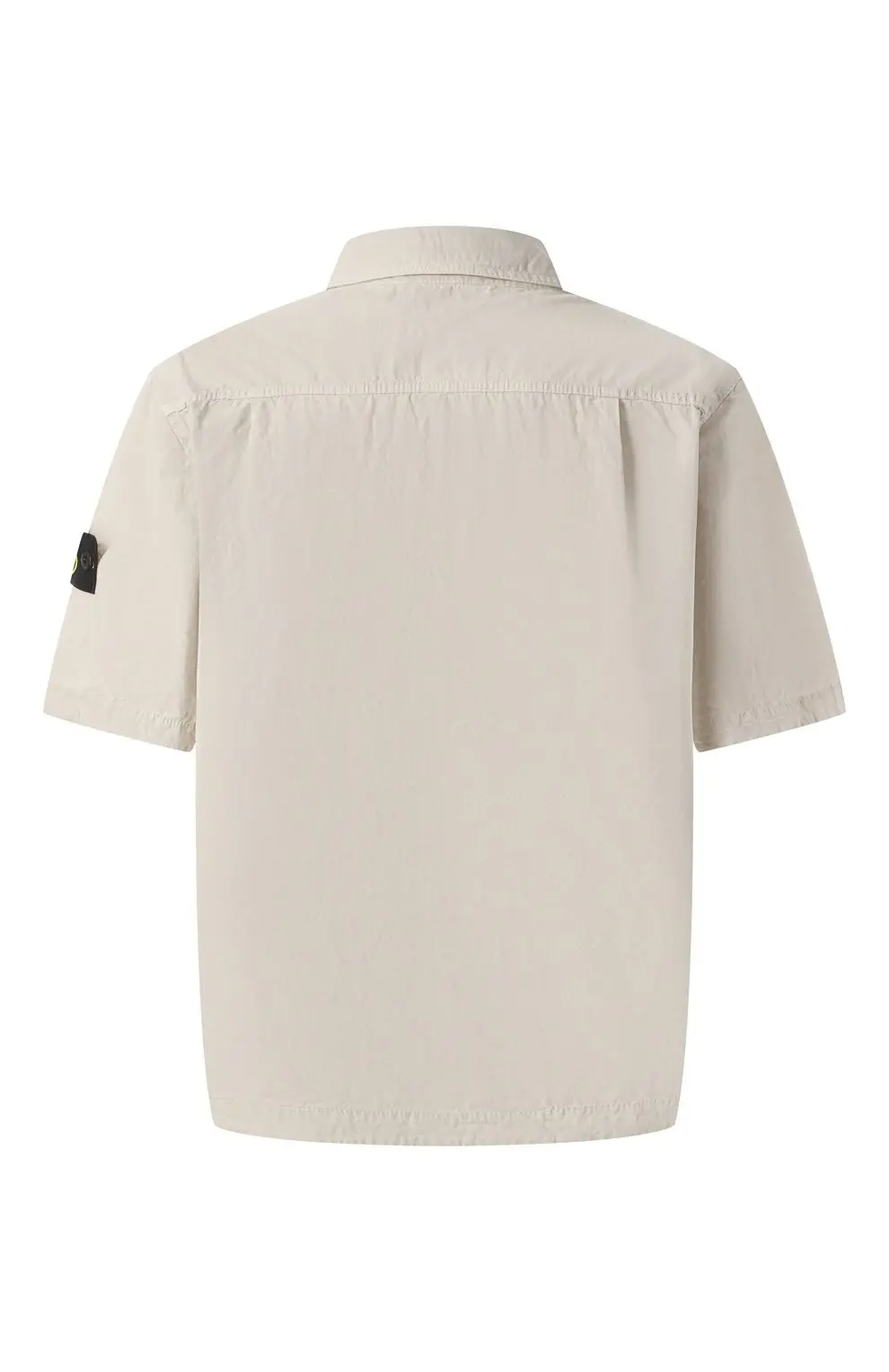 Светло-бежевая рубашка Stone Island с короткими рукавами выполнена из лёгкого хлопка с мягкой фактурой. Модель прямого силуэта с классическим воротником, застёжкой на пуговицы и двумя нагрудными карманами. Фирменный съёмный патч с эмблемой компаса на рукаве завершает дизайн, добавляя характерный акцент бренда.