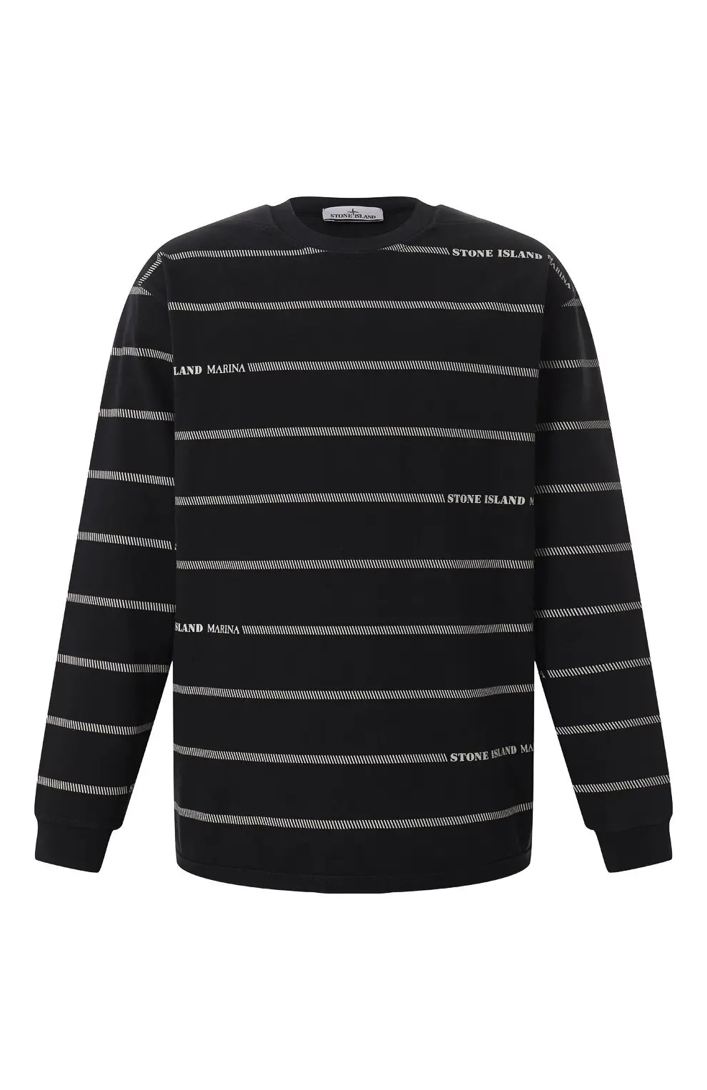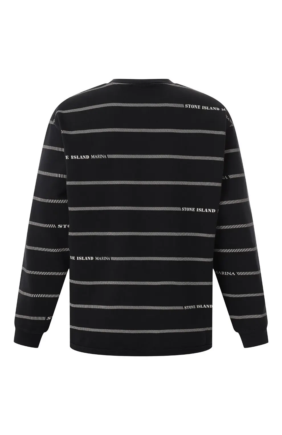 Хлопковый свитшот Stone Island выполнен из мягкого трикотажа с характерным полосатым узором и логотипами Stone Island Marina, расположенными по всей поверхности. Прямой крой и эластичные манжеты обеспечивают комфорт и свободу движений, а лаконичное оформление подчёркивает фирменную морскую эстетику бренда.